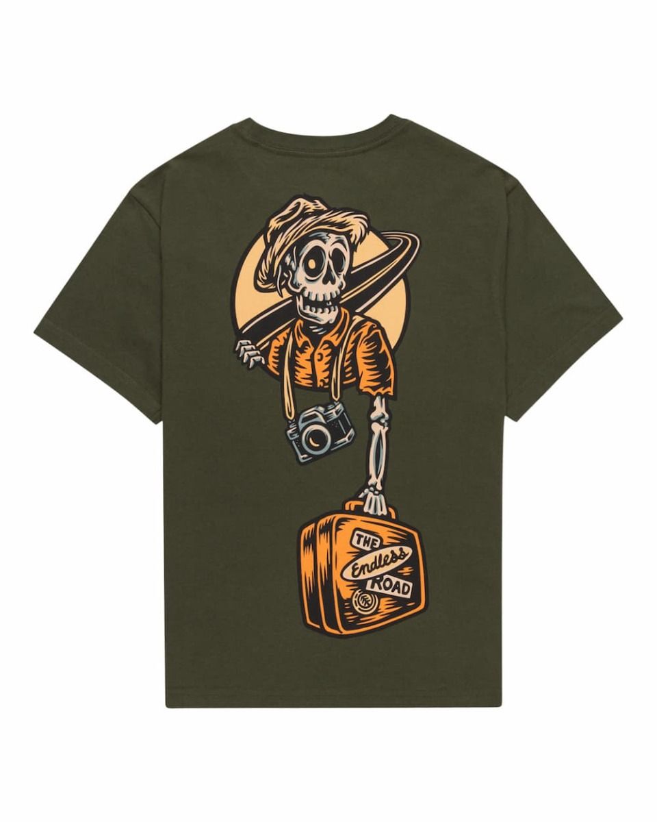 Esta camiseta sostenible de corte clásico, perteneciente a la Colección "The Endless Road" de Timber! y Element Brand, cuenta con cuello redondo, manga corta, punto canalé en mangas y dobladillo inferior, el logo de la colección serigrafiado en el lado izquierdo del pecho y un gráfico exclusivo de un esqueleto viajero obra del artista Chad Eaton (AKA Timber!) serigrafiado en la parte delantera.