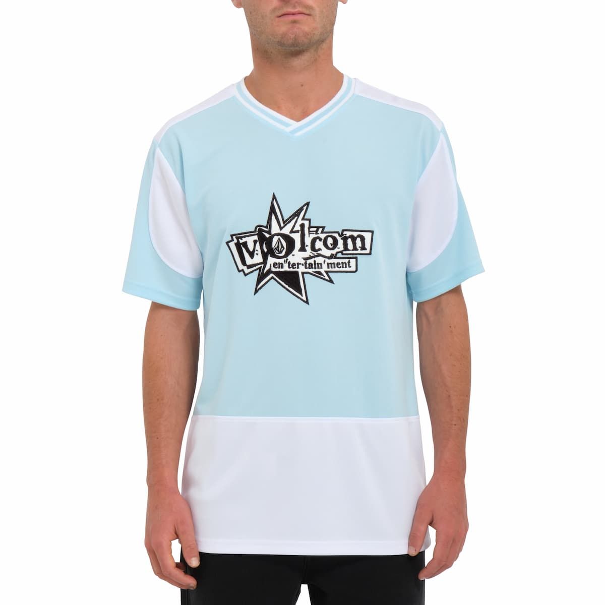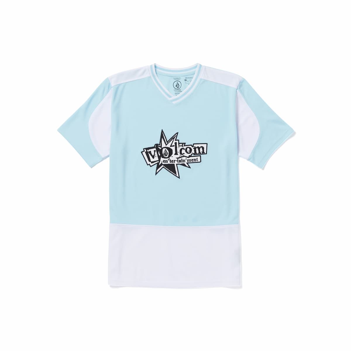 Esta camiseta bicolor de corte clásico, perteneciente a la Colección V Entertainment de Volcom y diseñada en colaboración con Noa Deane, cuenta con cuello de pico acanalado en dos colores, manga corta, serigrafiado Volcom Entertainment en la parte delantera y trasera, junto con apliques en contraste en las mangas.