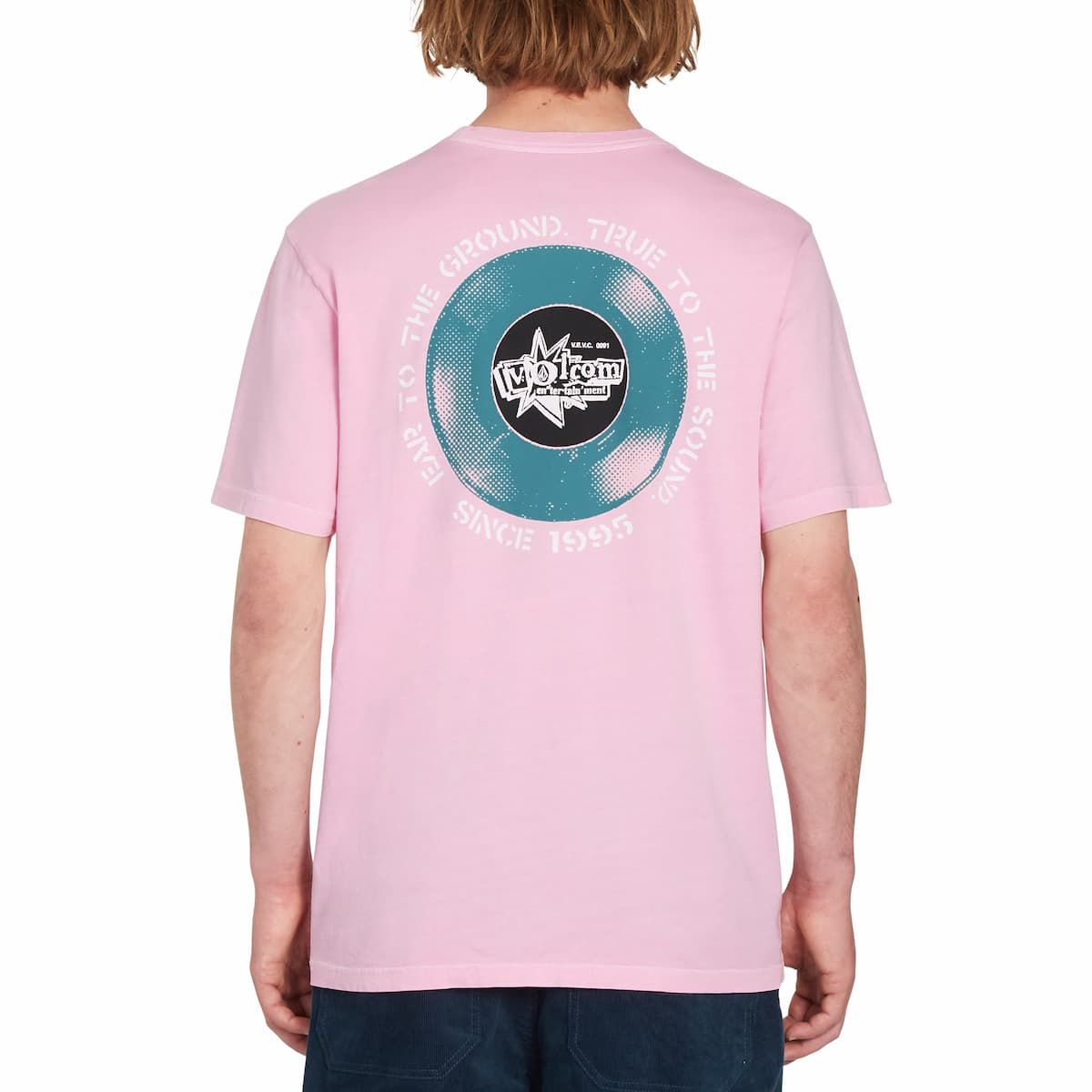 Esta camiseta de corte moderno cuenta con cuello redondo, manga corta, efecto blanqueado, estampado ligero Volcom Entertainment en el lado izquierdo del pecho, un gráfico de un LP con la inscripción "Ear to the ground.True to the Sound. Since 1995" impreso en la espalda y una discreta etiqueta de la marca tejida en el dobladillo.