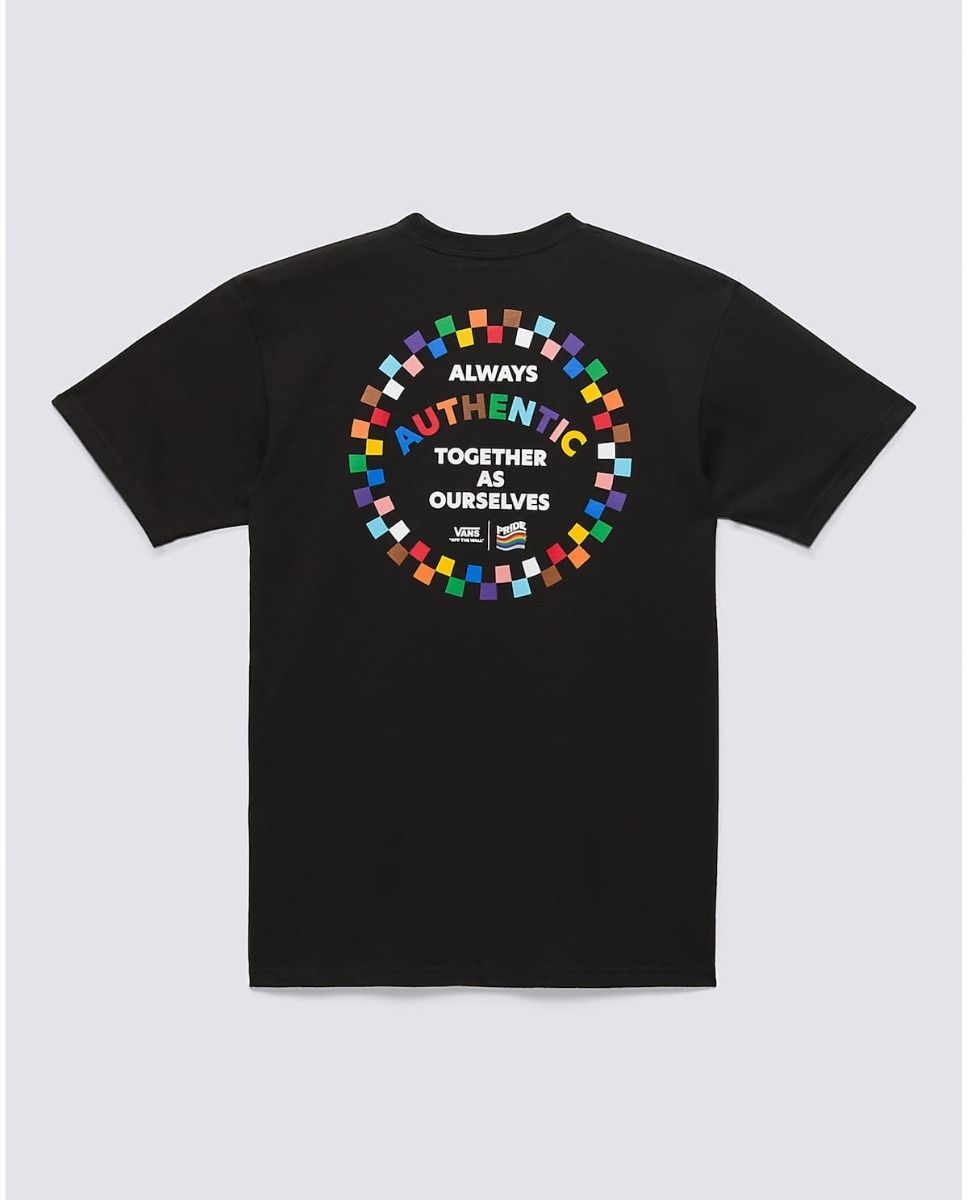 La camiseta 2023 Pride negra cuenta con cuello redondo, manga corta, serigrafiado Vans "Off The Wall" y Pride en el lado izquierdo del pecho y un gráfico circular Always Authentic de aspecto retro que celebra la individualidad compartida dentro de la comunidad queer estampado en la espalda.