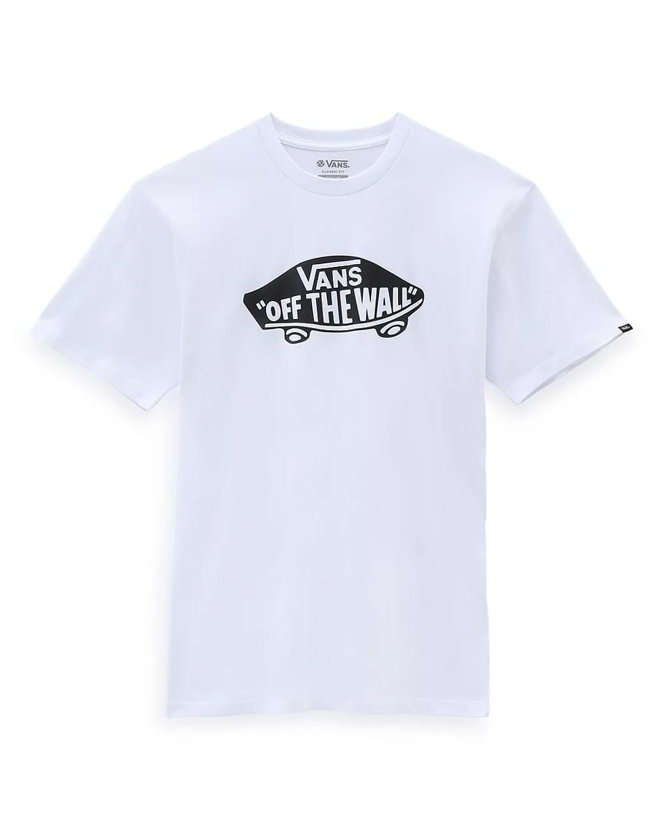 Esta camiseta blanca de ajuste clásico presenta manga corta, cuello redondo, el gráfico del emblemático monopatín "Off The Wall" serigrafiado en negro en la parte delantera y un sello de garantía Vans® en el cuello interior.
