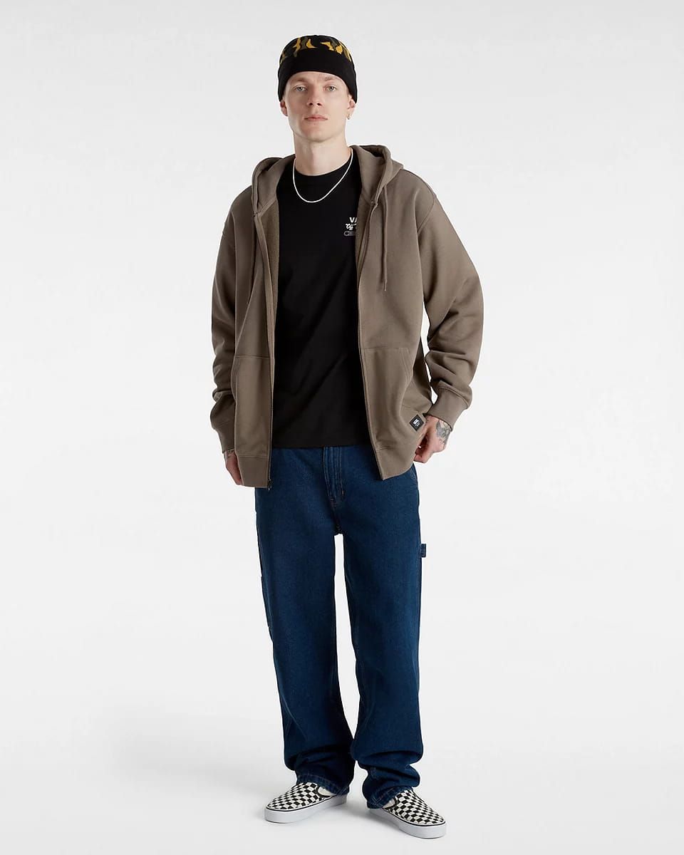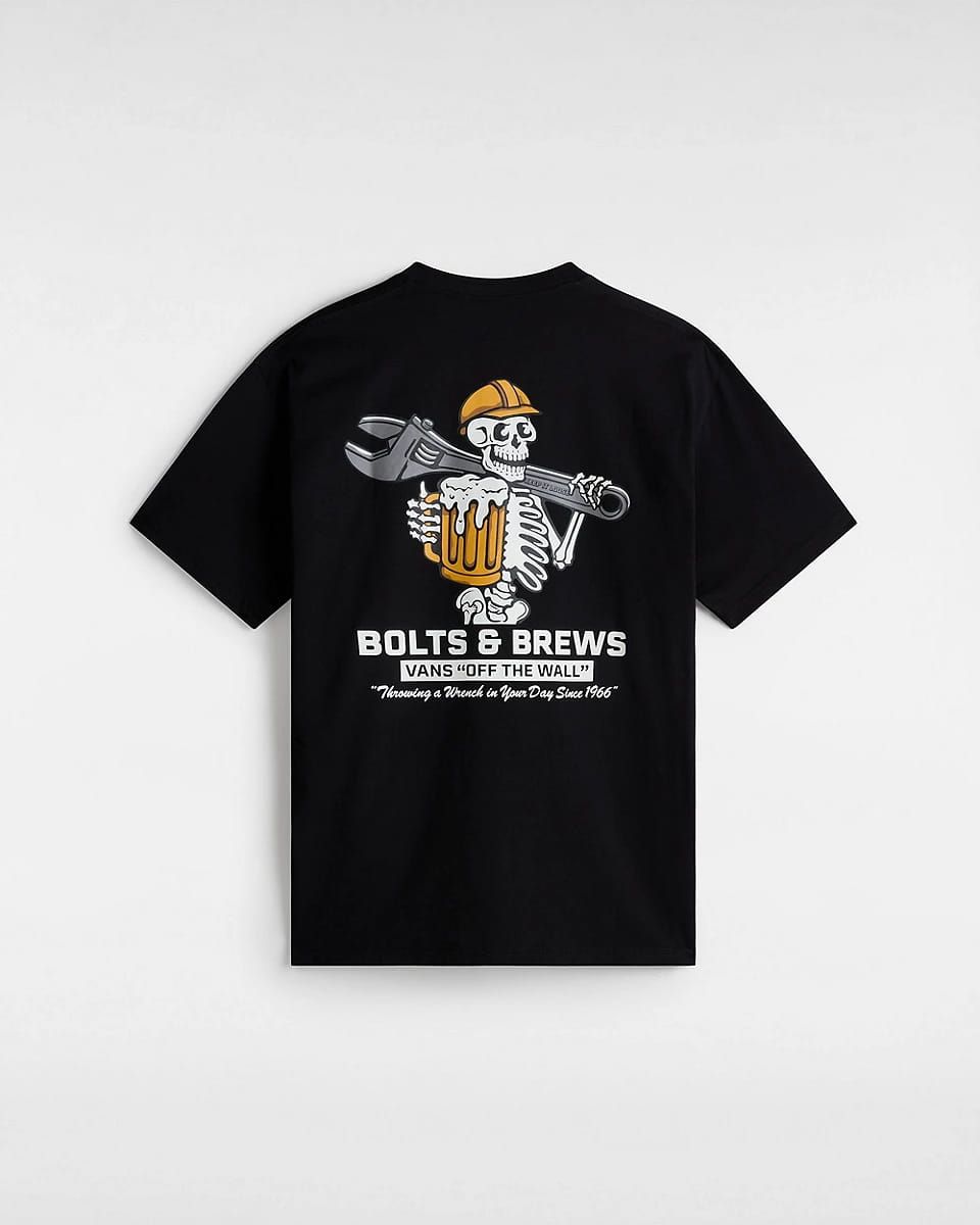Esta divertida camiseta de corte clásico cuenta con cuello redondo, manga corta, serigrafiado "Vans Off The Wall" con una llave inglesa en el lado izquierdo del pecho, junto con un gráfico de un esqueleto obrero bebiendo cerveza impreso en la espalda.