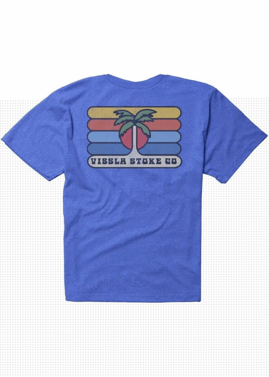 Esta camiseta de corte clásico cuenta con cuello redondo, manga corta, el logo de Vissla serigrafiado en el lado izquierdo del pecho y un gráfico artístico de una palmera con la inscripción "Vissla Stoke Co." impreso en la espalda.