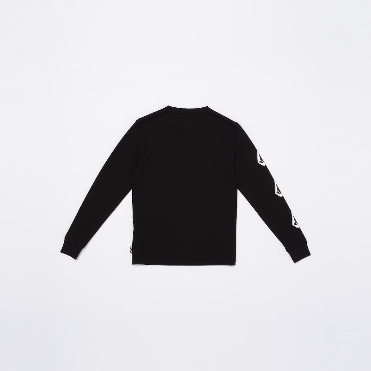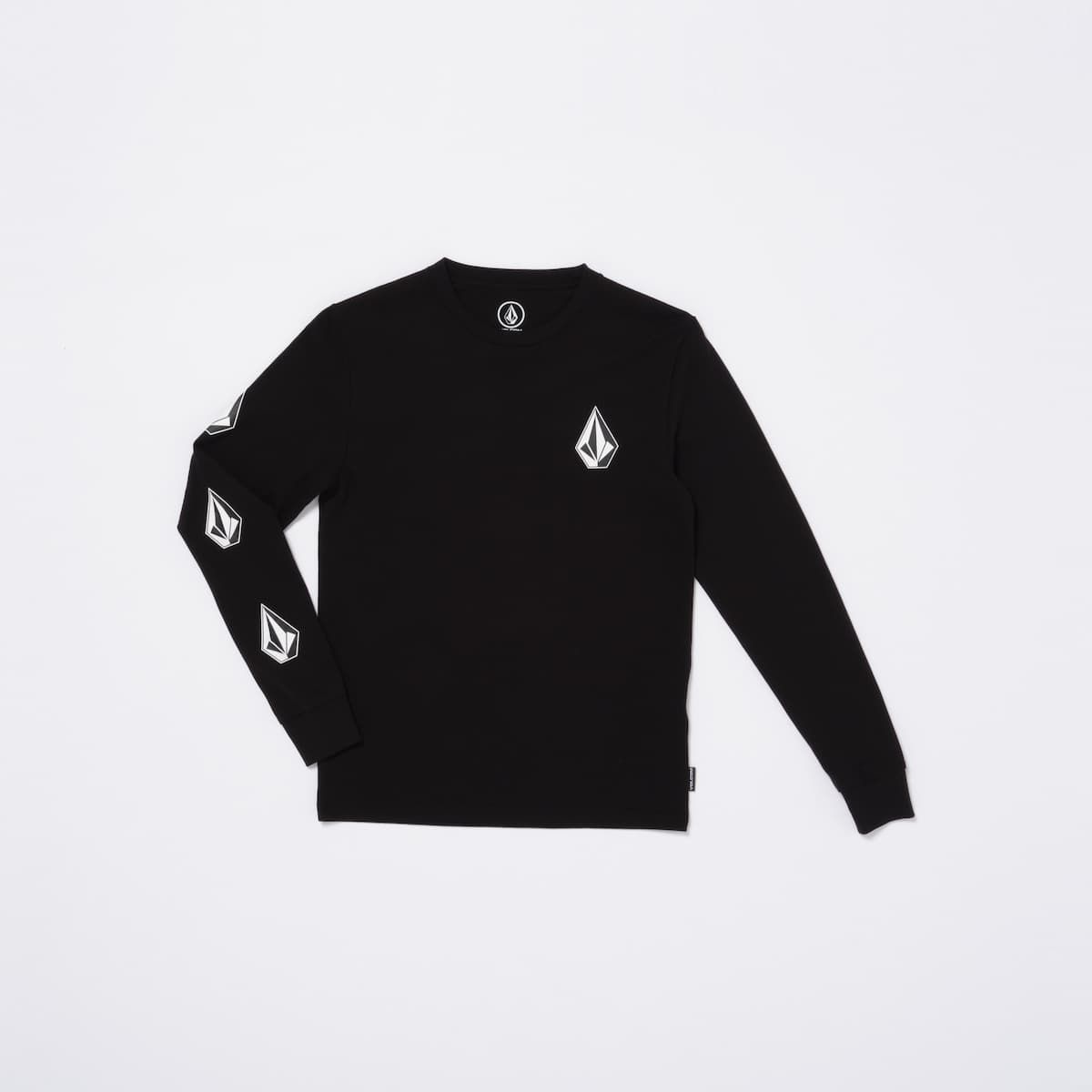 Esta camiseta eco-friendly negra para niño de corte básico cuenta con cuello redondo con el borde en tono sobre tono, manga larga, estampado ligero Stone en el lado izquierdo del pecho, estampado triple Stone en la manga derecha y el sello de garantía Volcom termofijado en el cuello interior.