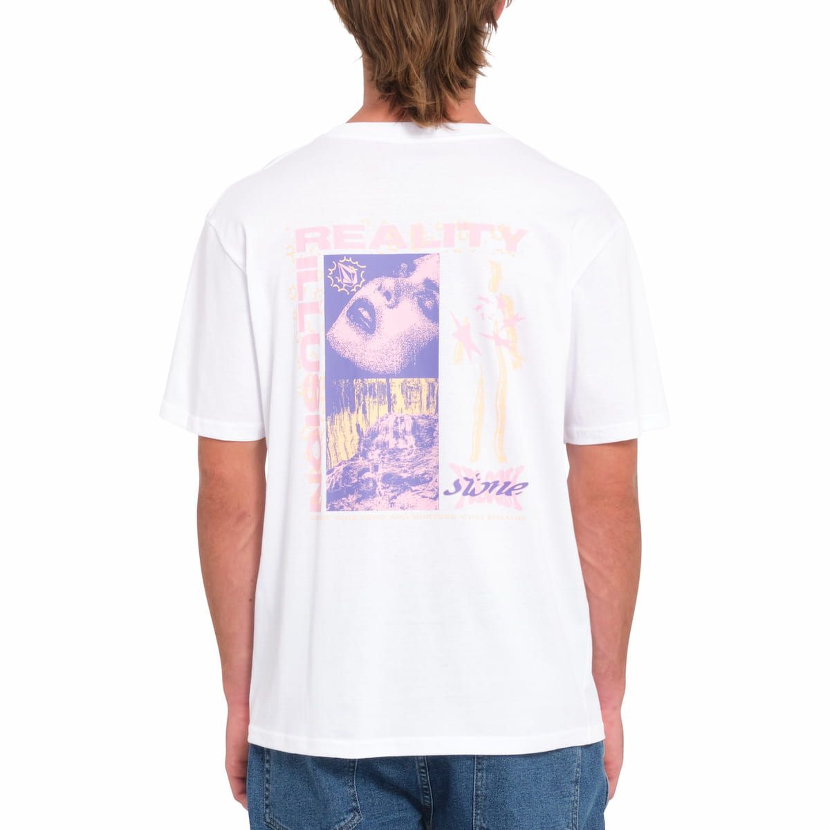 Esta camiseta orgánica básica color blanco cuenta con corte clásico, cuello redondo, manga corta, junto con un estampado artístico "Realusion" serigrafiado en la parte delantera y posterior.