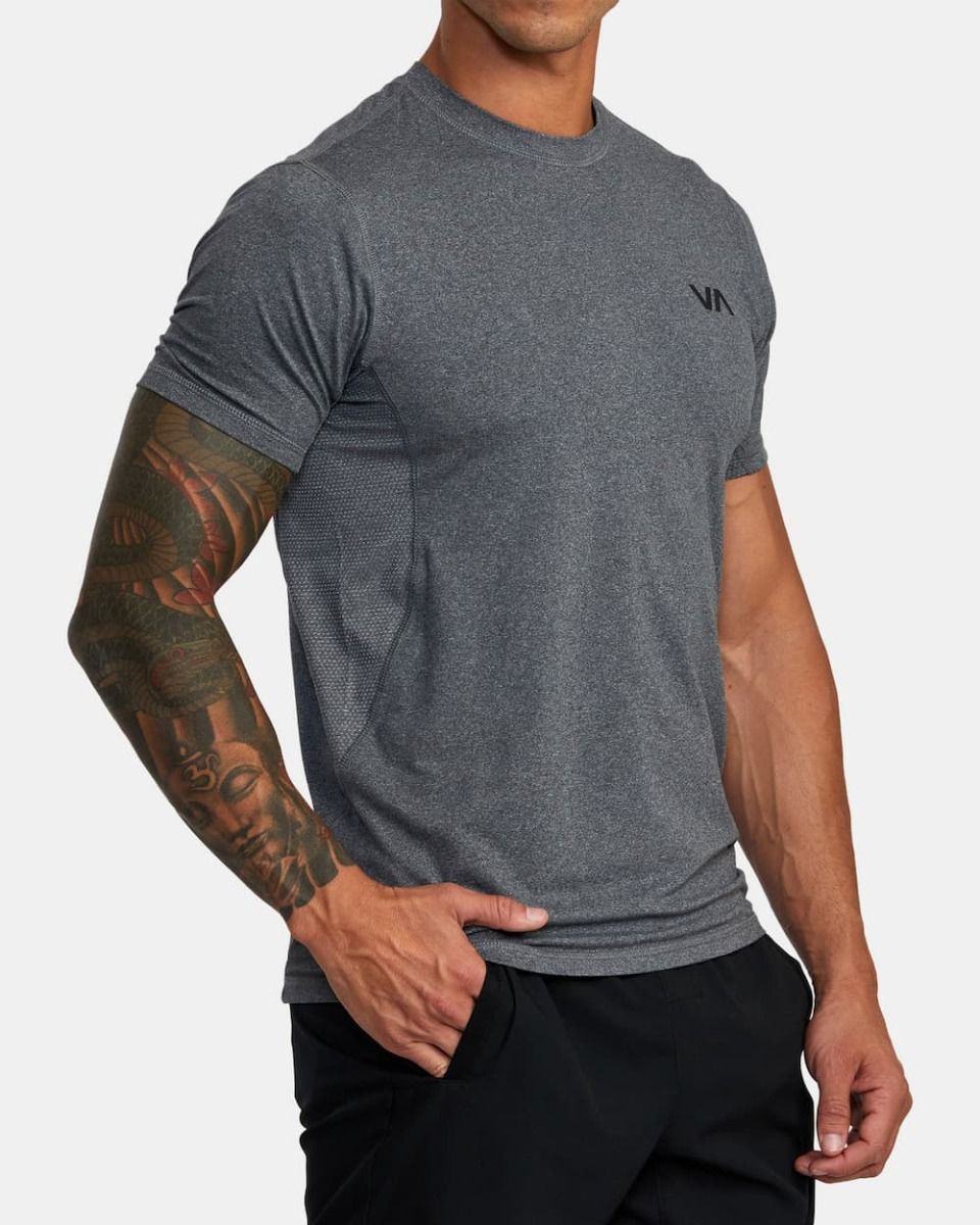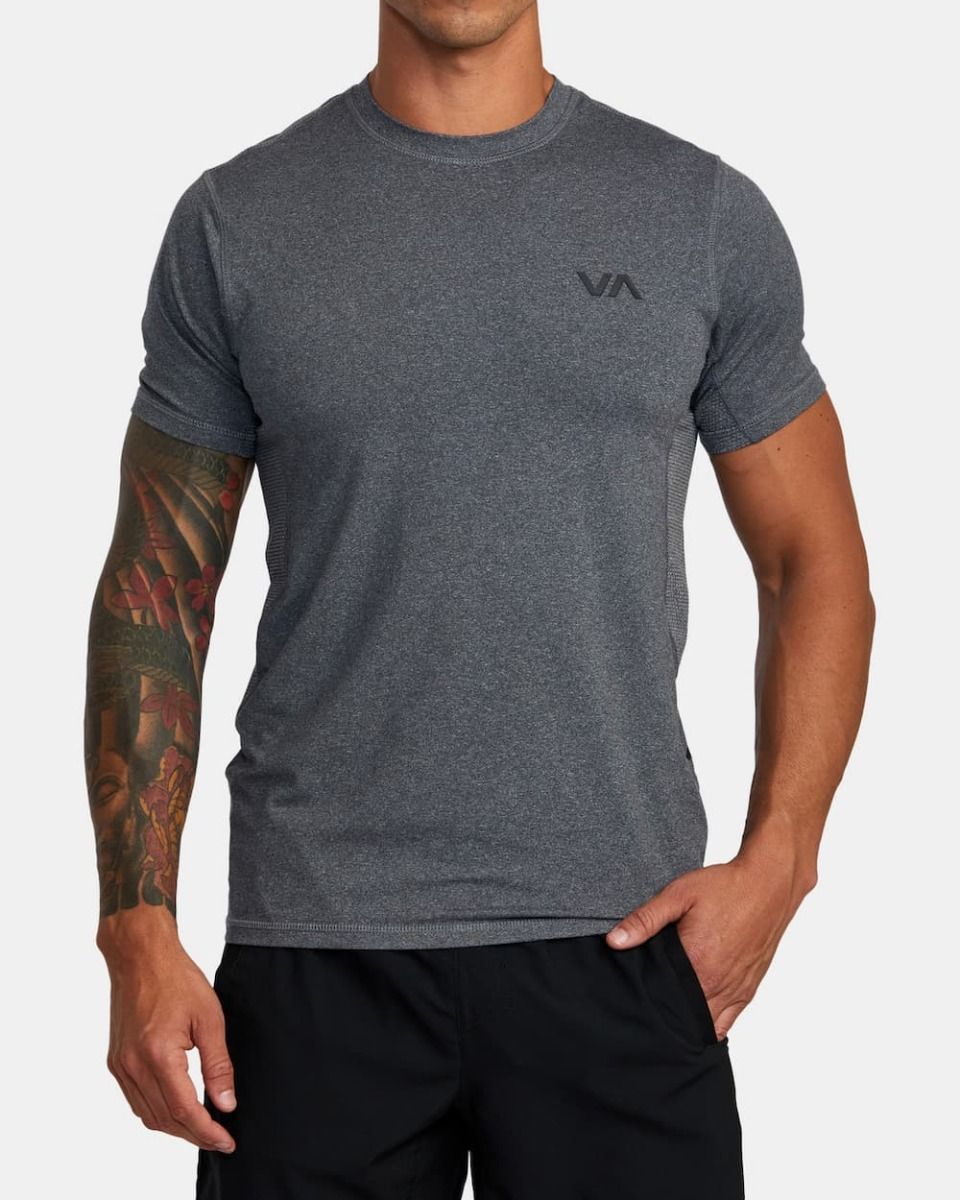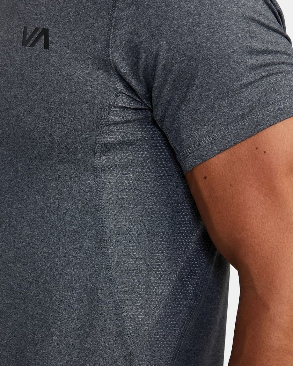 El top de manga corta para hombre VA Sport Vent en gris (Charcoal Heather) de Rvca está confeccionada con tejido elástico en 4 direcciones en mezcla de 90% poliéster reciclado y 10% elastano.
