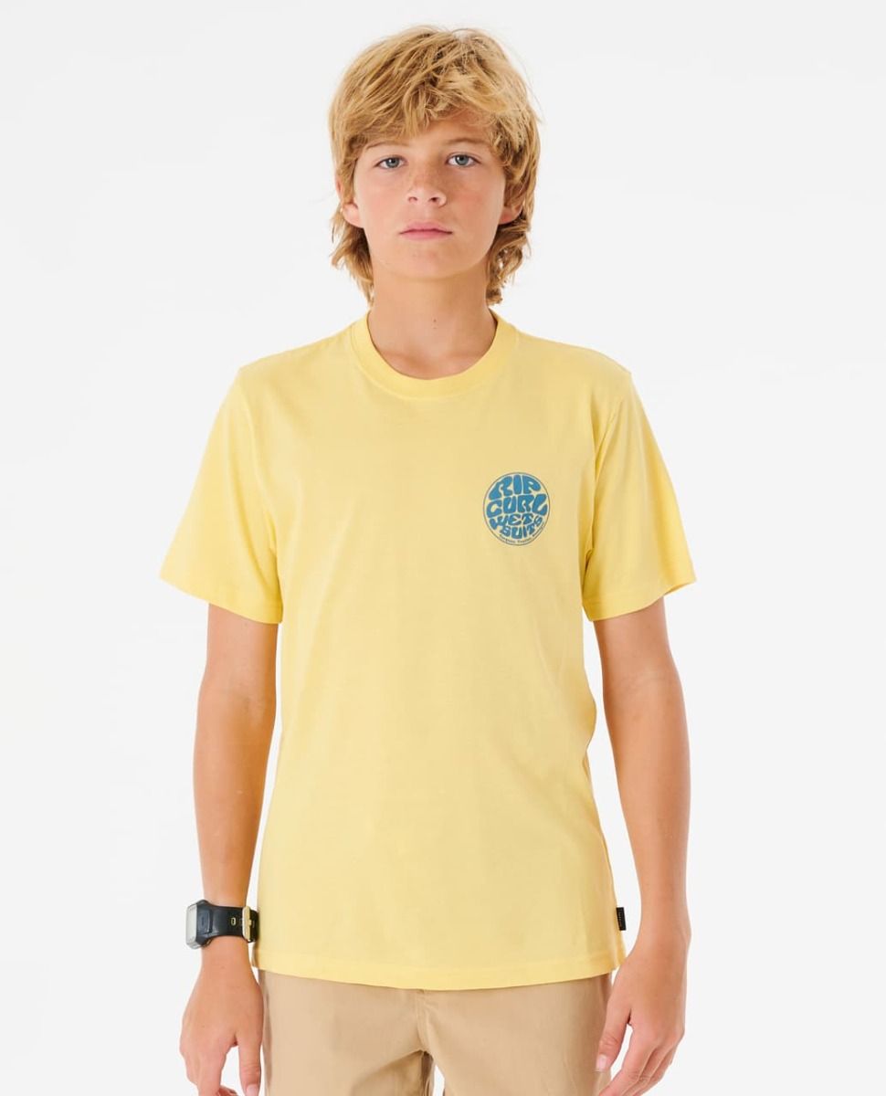 La camiseta para niños de entre 8 y 16 años Wetsuit Icon Tee Boy en tono amarillo manteca (Butter Yellow) de Rip Curl está confeccionada con 100% tejido jersey de algodón orgánico (160g).