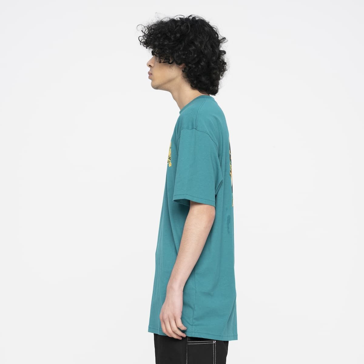 La camiseta de manga corta Winkowski Volcano Dot Verdigris para hombre tiene una etiqueta de garantía Santa Cruz Skateboards en el cuello interior.