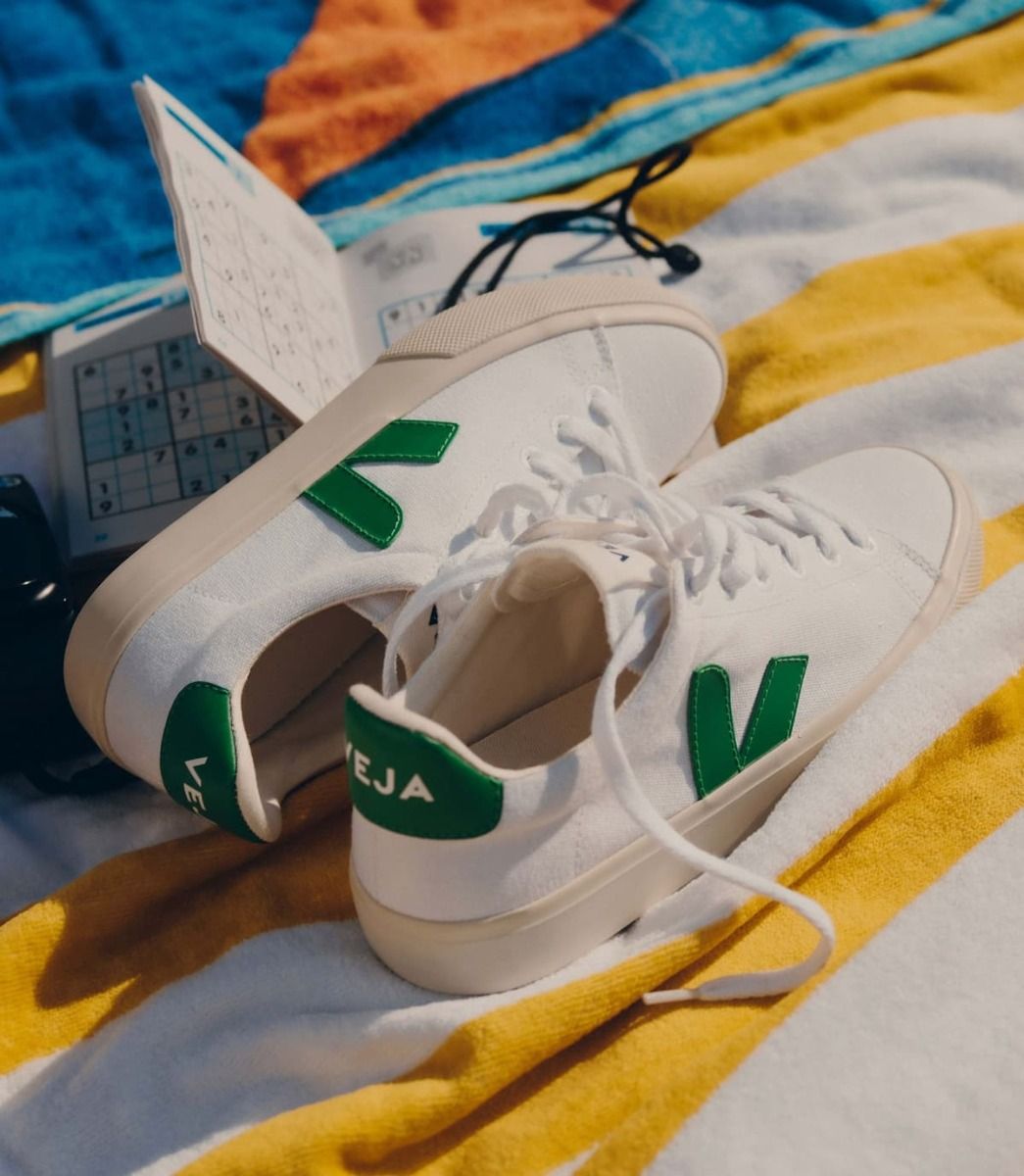 Estas sneakers de lona cómodas y eco-friendly cuentan con el icónico logo en "V" de Veja de caucho amazónico (26%) en color verde esmeralda en los laterales, suela externa de 40% caucho del Amazonas y 10% de caucho reciclado, plantilla de origen biológico elaborada con caña de azúcar (42%), caucho amazónico (11%), E.V.A.* reciclado (11%) y algodón orgánico (12%).