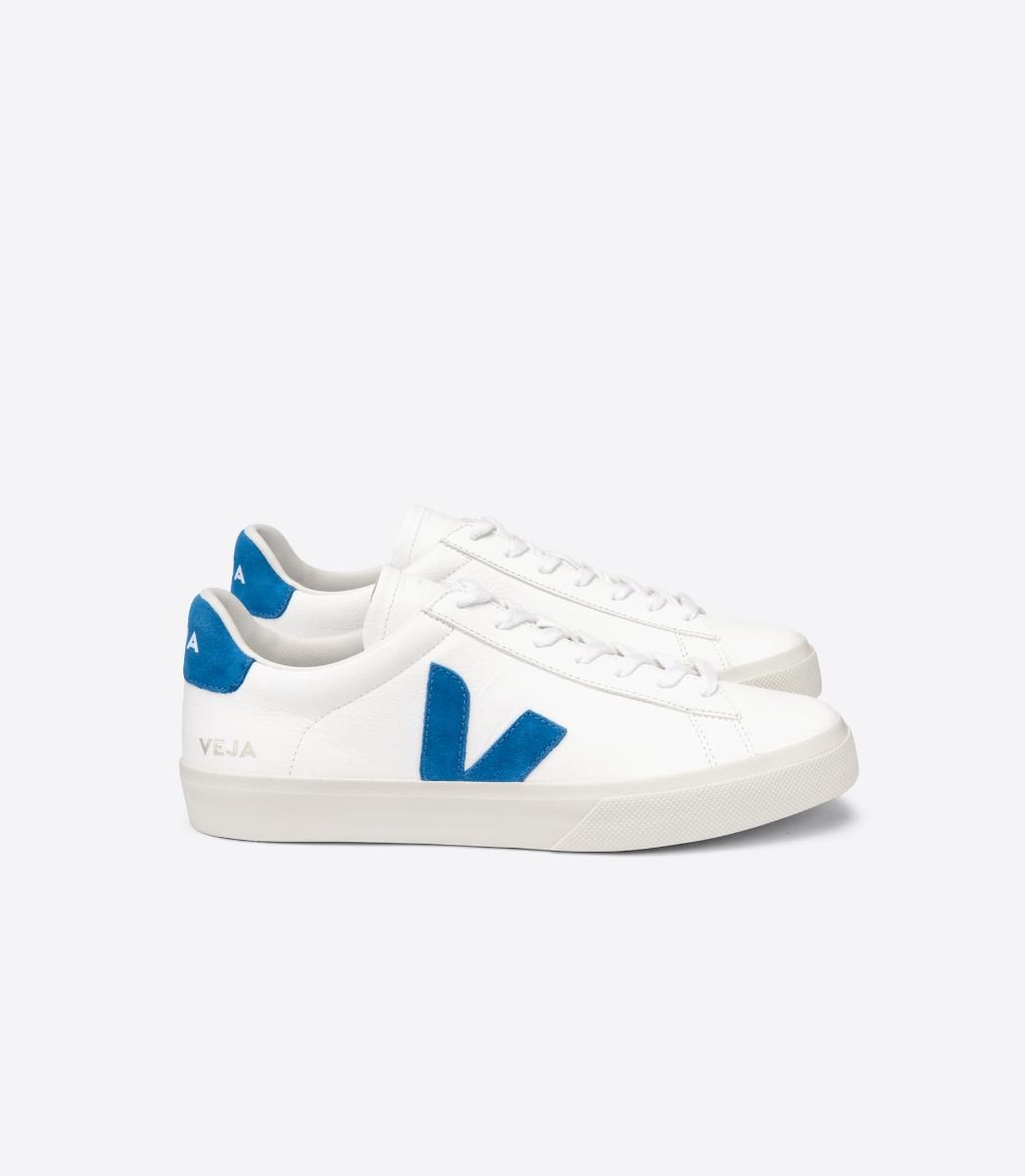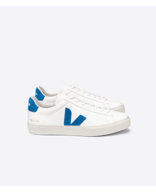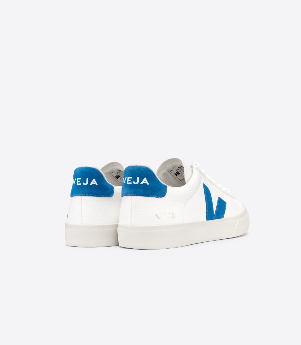 Zapatillas Ecológicas Veja Campo Chromefree Leather blancas con detalles en color azul y suela de goma blanca Unisex | Extra White Swedish Blue