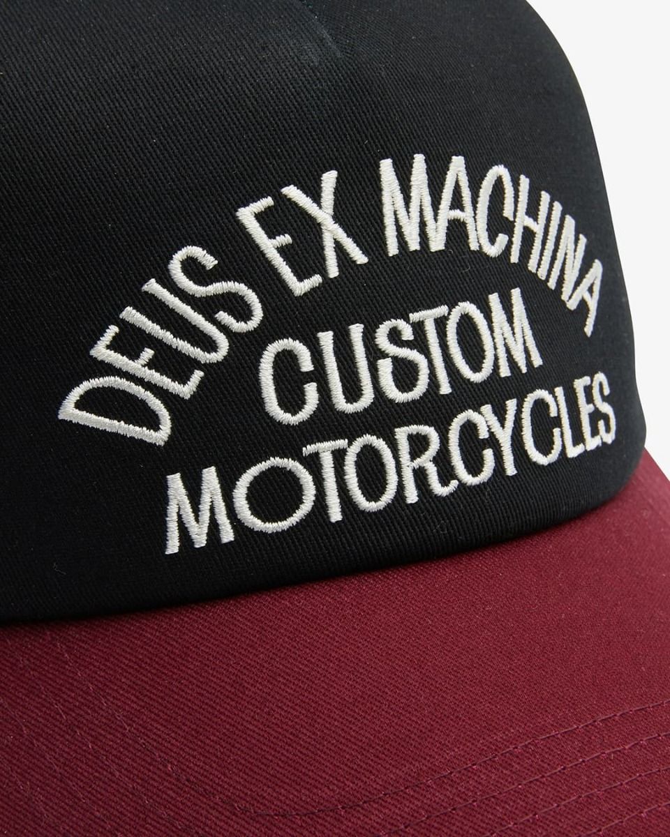 Esta gorra de estilo camionero cuenta con visera ligeramente curvada, paneles laterales de malla, cierre posterior ajustable a presión de plástico, bordado de la marca en el panel trasero y bordado "Deus Ex Machina Custom Motorcycles" en el panel frontal.
