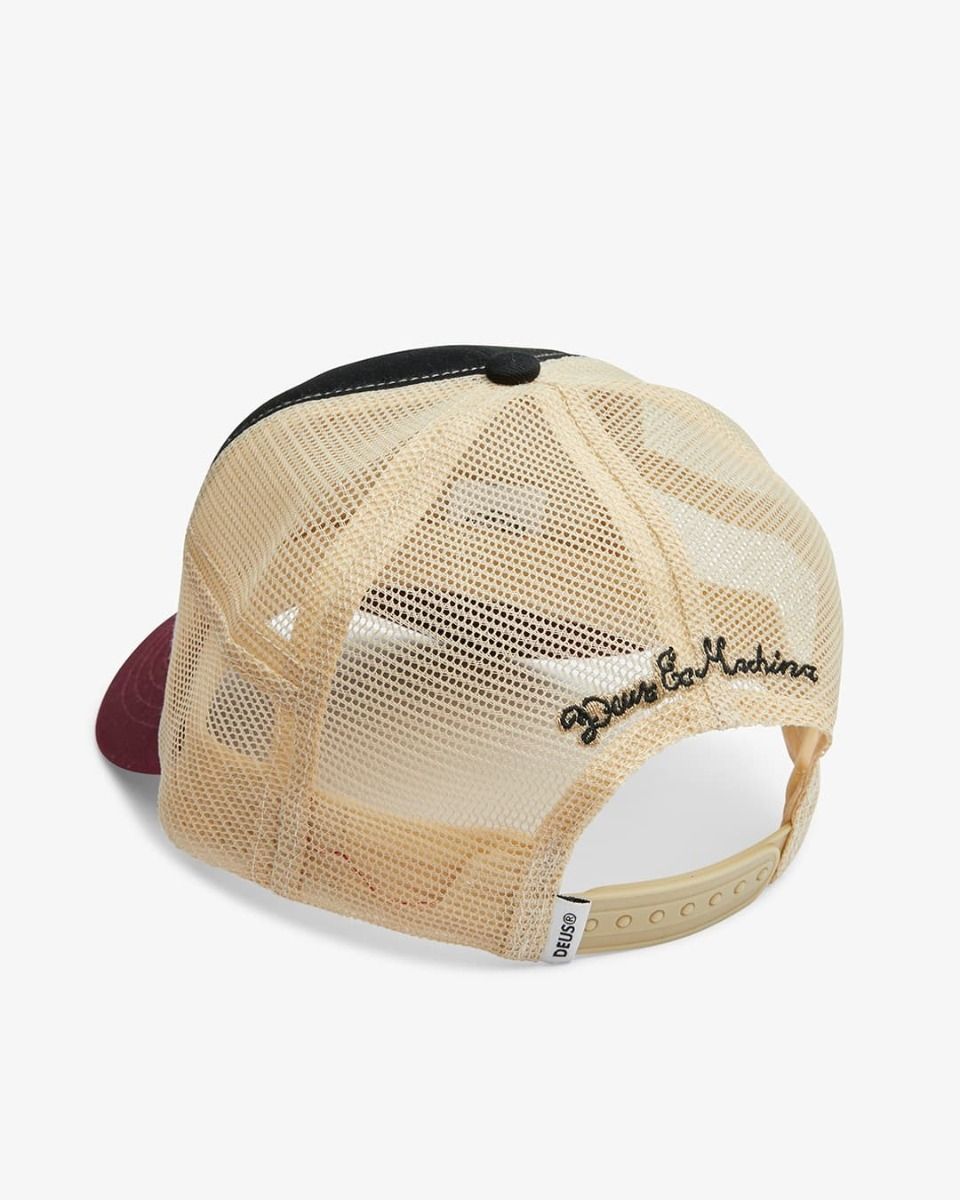 La gorra para hombre Canyons Trucker en negro combinado con granate y beige (Black Combo) de Deus Ex Machina está confeccionada con poliéster y sarga de algodón.