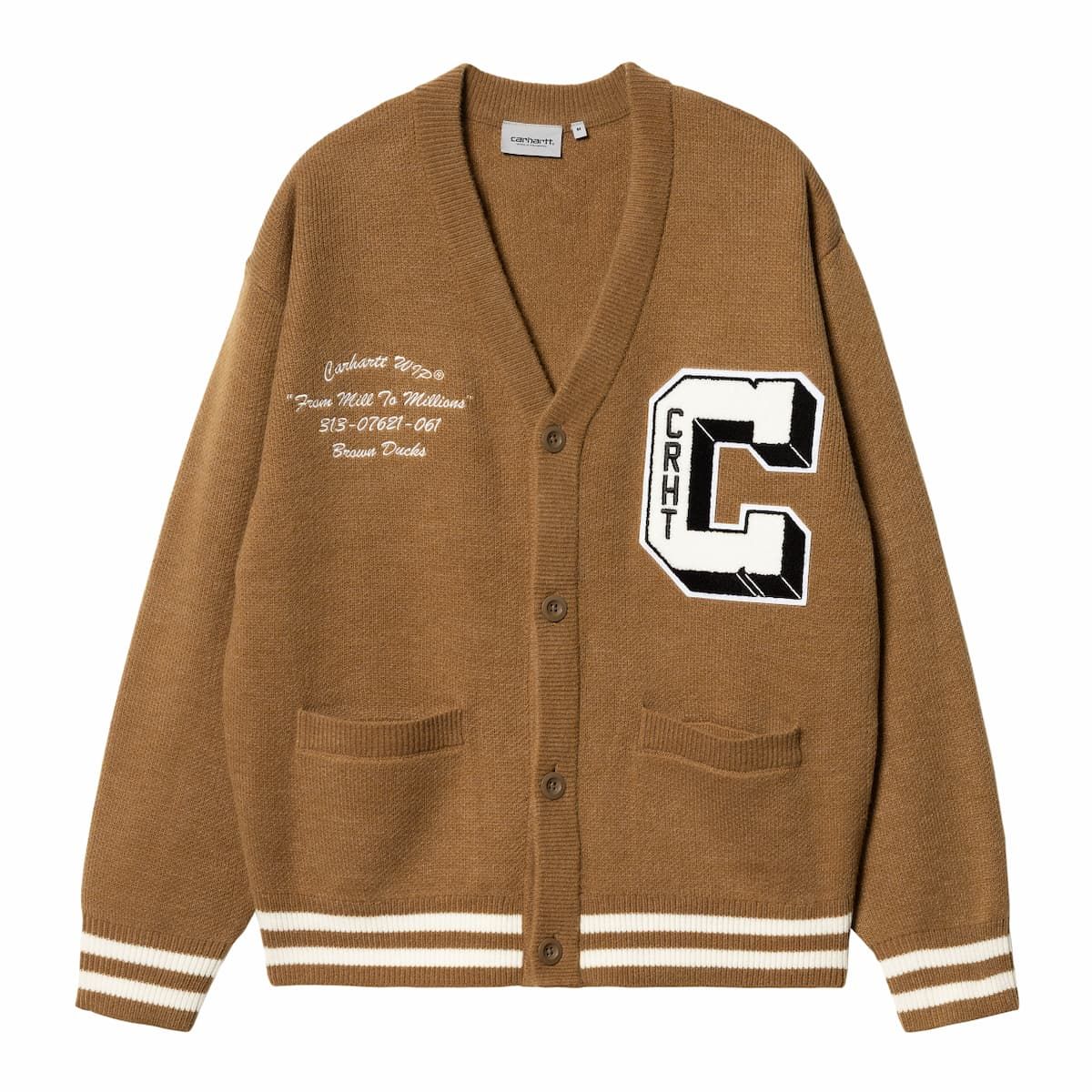 Esta chaqueta de estilo universitario presenta cuello de pico, puños y dobladillo acanalados, cierre de botones, junto con la inscripción "Carhartt WIP "From Mill To Millions" 313-07621-061 Brown Ducks" y el logo de la "C" bordados en blanco.