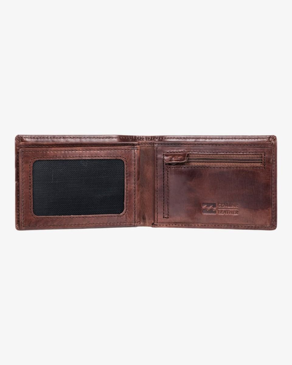 Esta elegante cartera de piel en color chocolate cuenta con tres pliegues, forro en relieve, billetera, bolsillo monedero con cremallera, ranuras interiores para tarjetas, ventana de malla para el DNI, bloqueo de identificación por radiofrecuencia (RFID) para proteger tus tarjetas ante el robo de datos, una pequeña insignia metálica de Billabong en la parte delantera y el logo de la marca grabado en relieve en el interior.