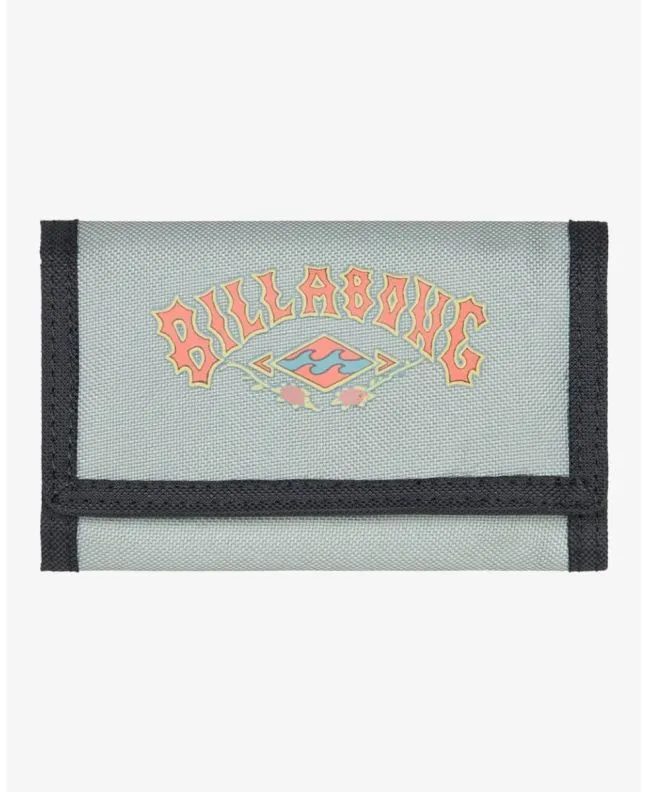 Cartera Billabong de triple hoja con velcro y tejido reciclado en color verde grisáceo.
