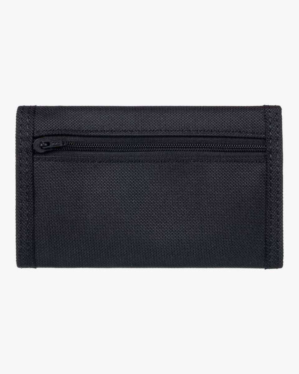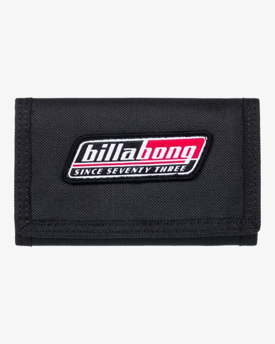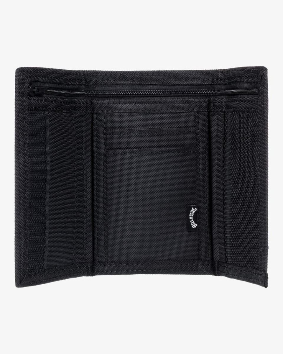 Esta billetera negra con diseño de triple pliegue cuenta con cierre autoadherente de velcro, compartimento para billetes con cremallera, bolsillo exterior monedero con cierre de cremallera, ranuras para tarjetas y un parche Billabong cosido en la parte delantera.