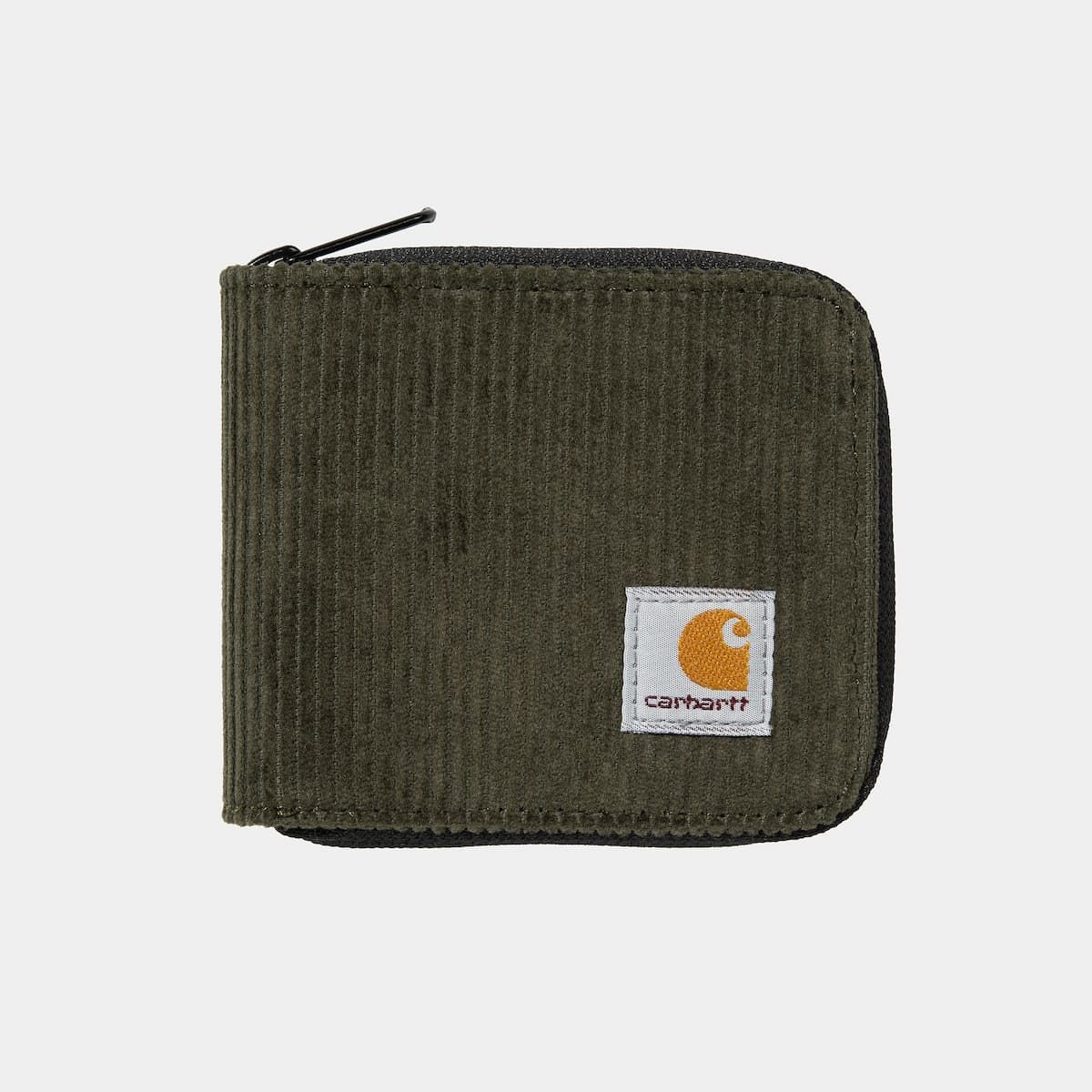 Esta cartera de pana cuenta con doble hoja, cierre de cremallera, forro, bolsillo para billetes, bolsillo para monedas con solapa y cierre de botón a presión, tres ranuras para tarjetas, bolsillos interiores ocultos en ambos lados y una etiqueta cuadrada con el logo de Carhartt WIP tejida en la parte delantera.