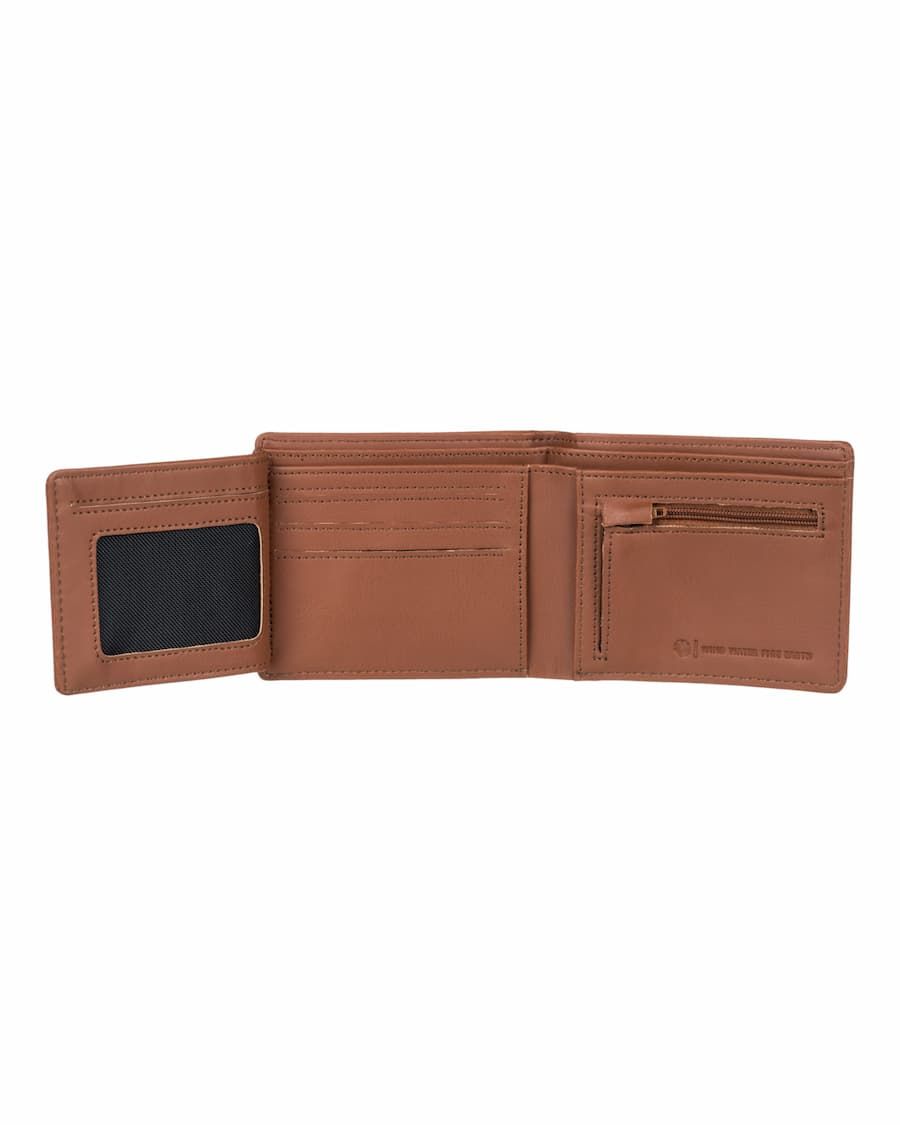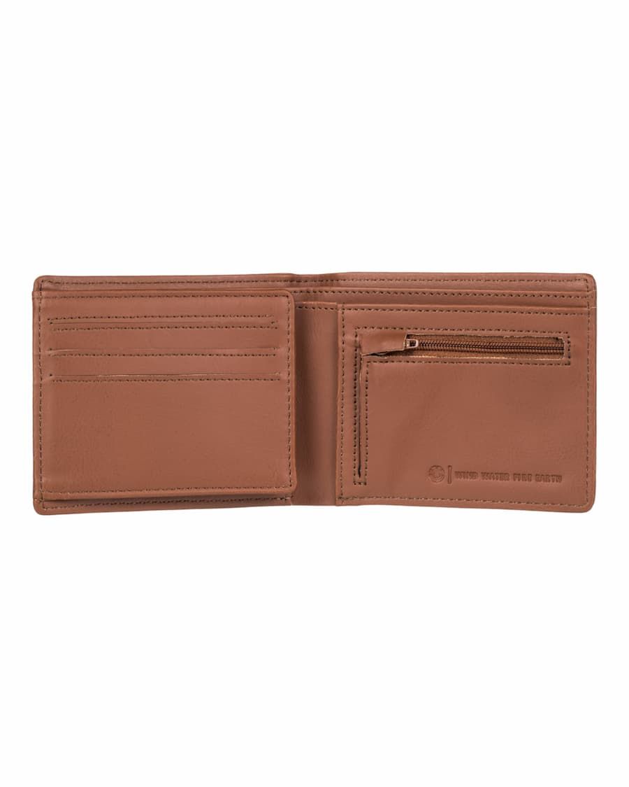 Esta cartera para uso diario con diseño en tres pliegues cuenta con billetera, un bolsillo para monedas con cremallera, seis ranuras para tarjetas, dos ranuras ocultas, una ventana de malla para DNI, la mitad del logo del árbol de Element grabado en relieve en la parte delantera y el logo de Element junto con la inscripción "Wind-Water-Fire-Earth" (Viento-Agua-Fuego-Tierra) grabados en el interior.