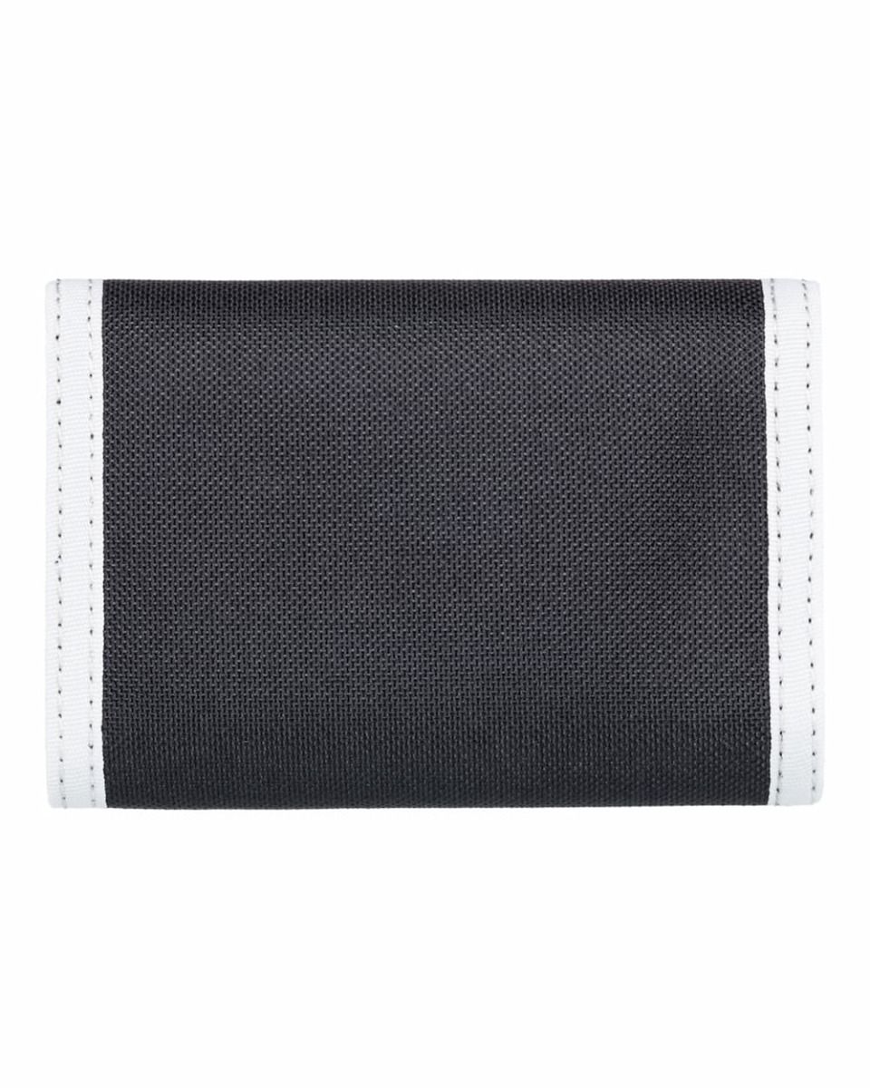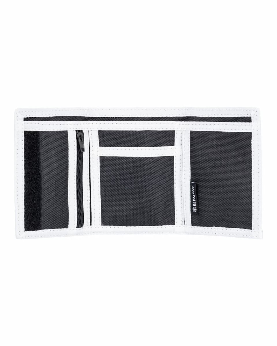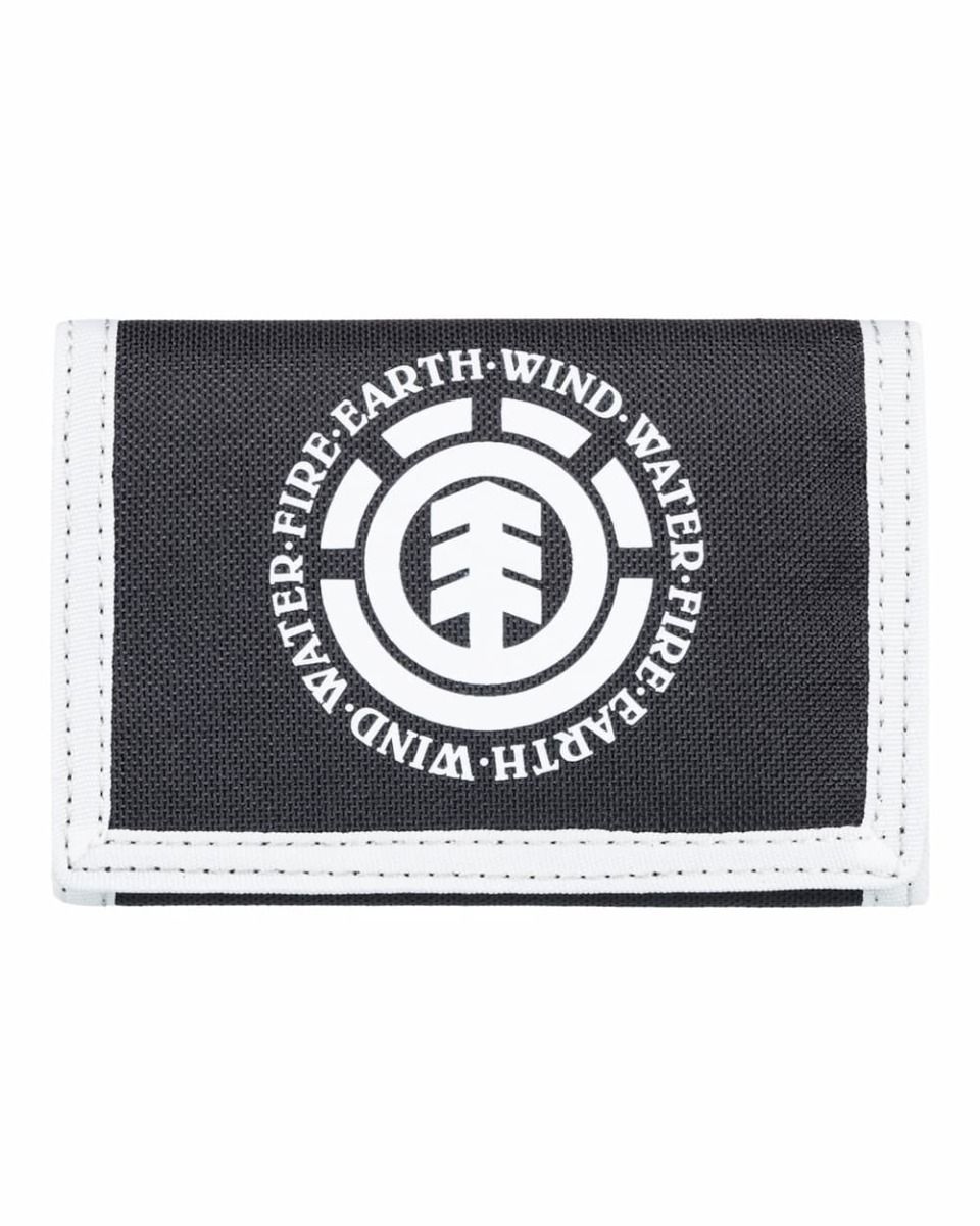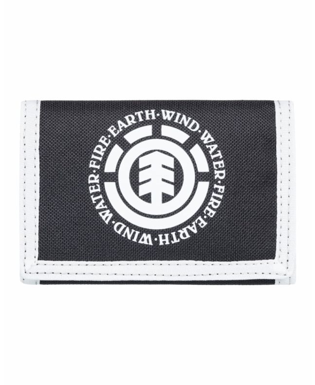 Esta cartera en tono negro y gris cuenta con diseño de triple pliegue, exterior y forro de poliéster reciclado, bolsillo para monedas con cremallera, 3 ranuras interiores para tarjetas, compartimento para los billetes, cierre de velcro autoadherente y el logo del árbol Element serigrafiado en gris junto con los cuatro elementos (Wind-Water-Fire-Earth) en la zona delantera.