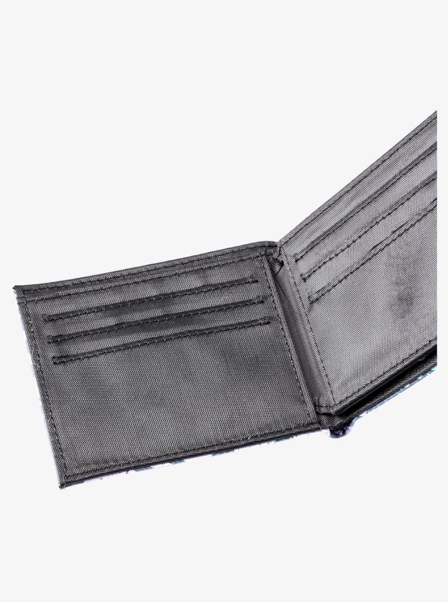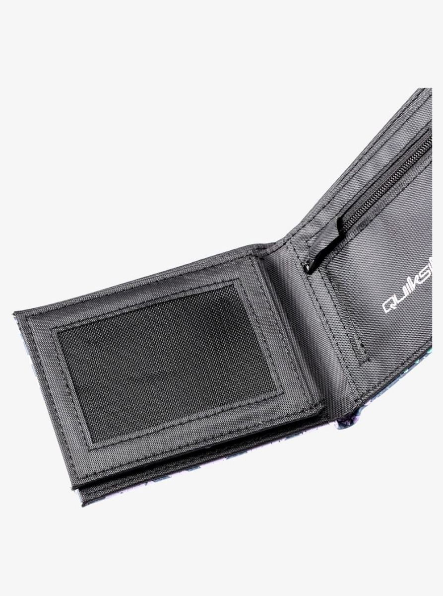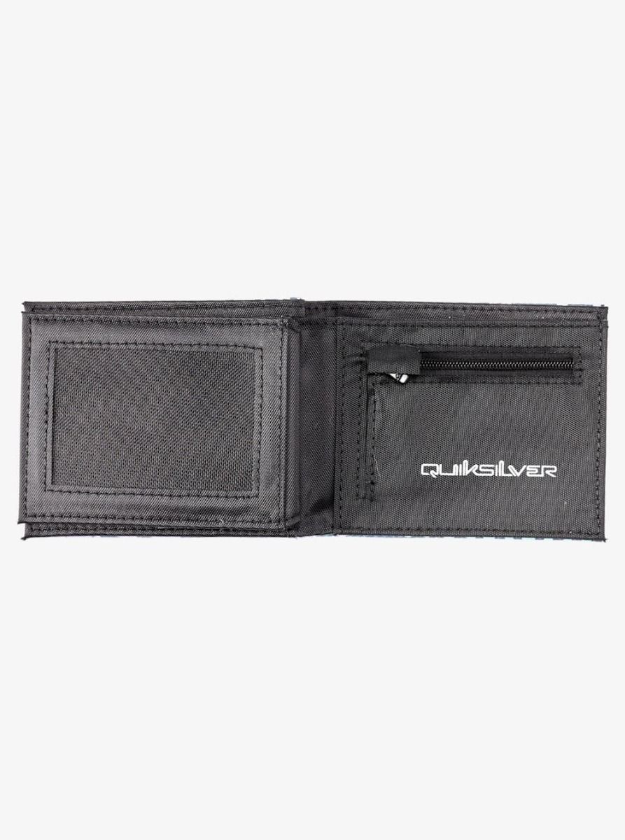 Esta cartera de triple pliegue cuenta con exterior de cuero sintético, interior de nailon, compartimento para billetes, bolsillo para monedas con cremallera, ranuras interiores para tarjetas, compartimento de malla para el DNI, ilustraciones con el logo de Quiksilver serigrafiadas en el exterior, grabado Quiksilver en el interior y una placa metálica de la marca en el frente.