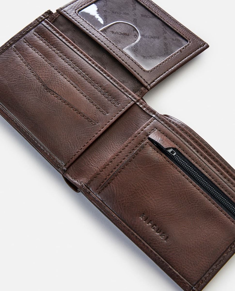 Esta elegante cartera de dos pliegues cuenta con billetero doble, bolsillo para monedas con cremallera, una ventana para guardar el DNI, ranuras para tus tarjetas, forro de cuero de PU y el logo de Rip Curl metálico en la parte delantera.