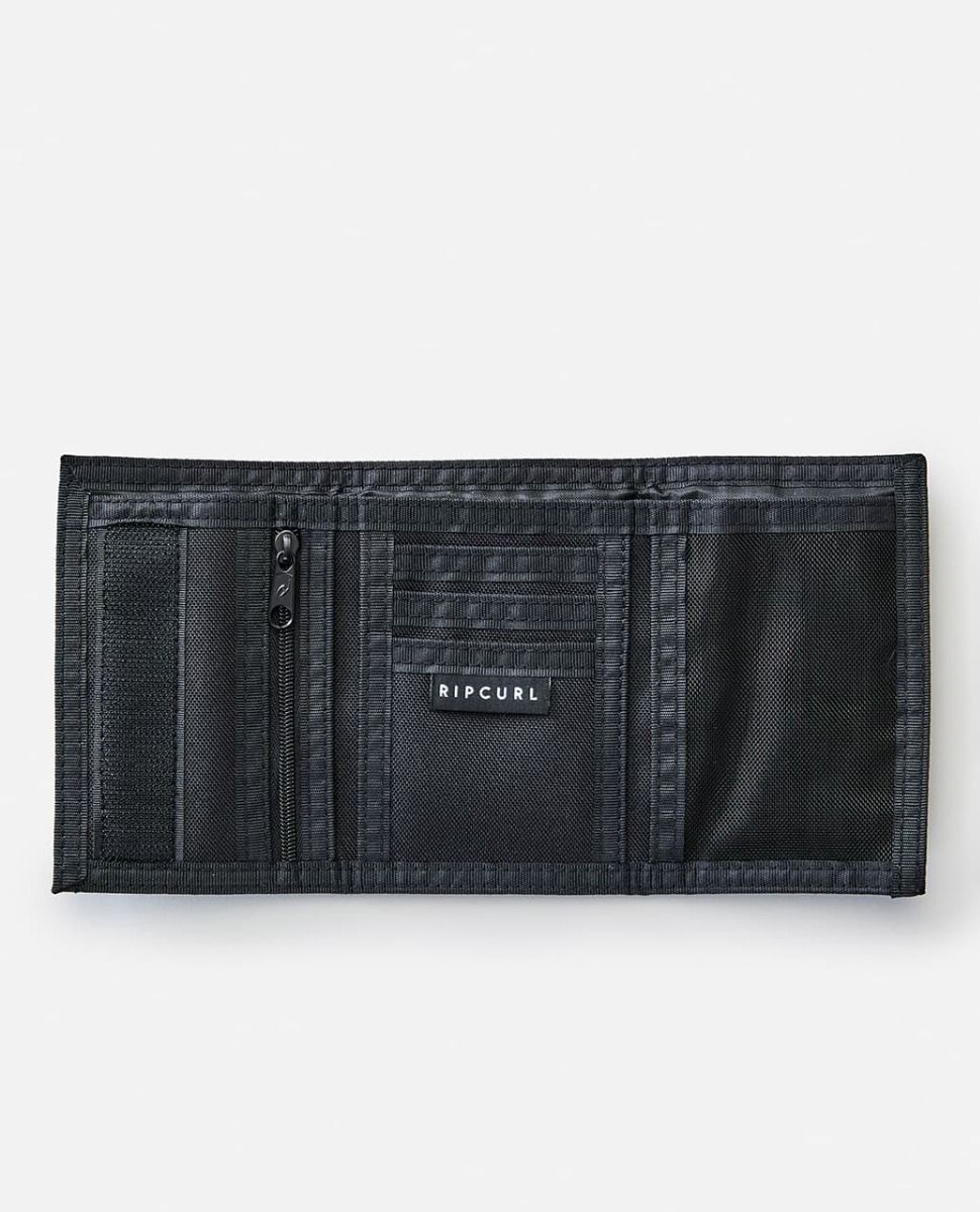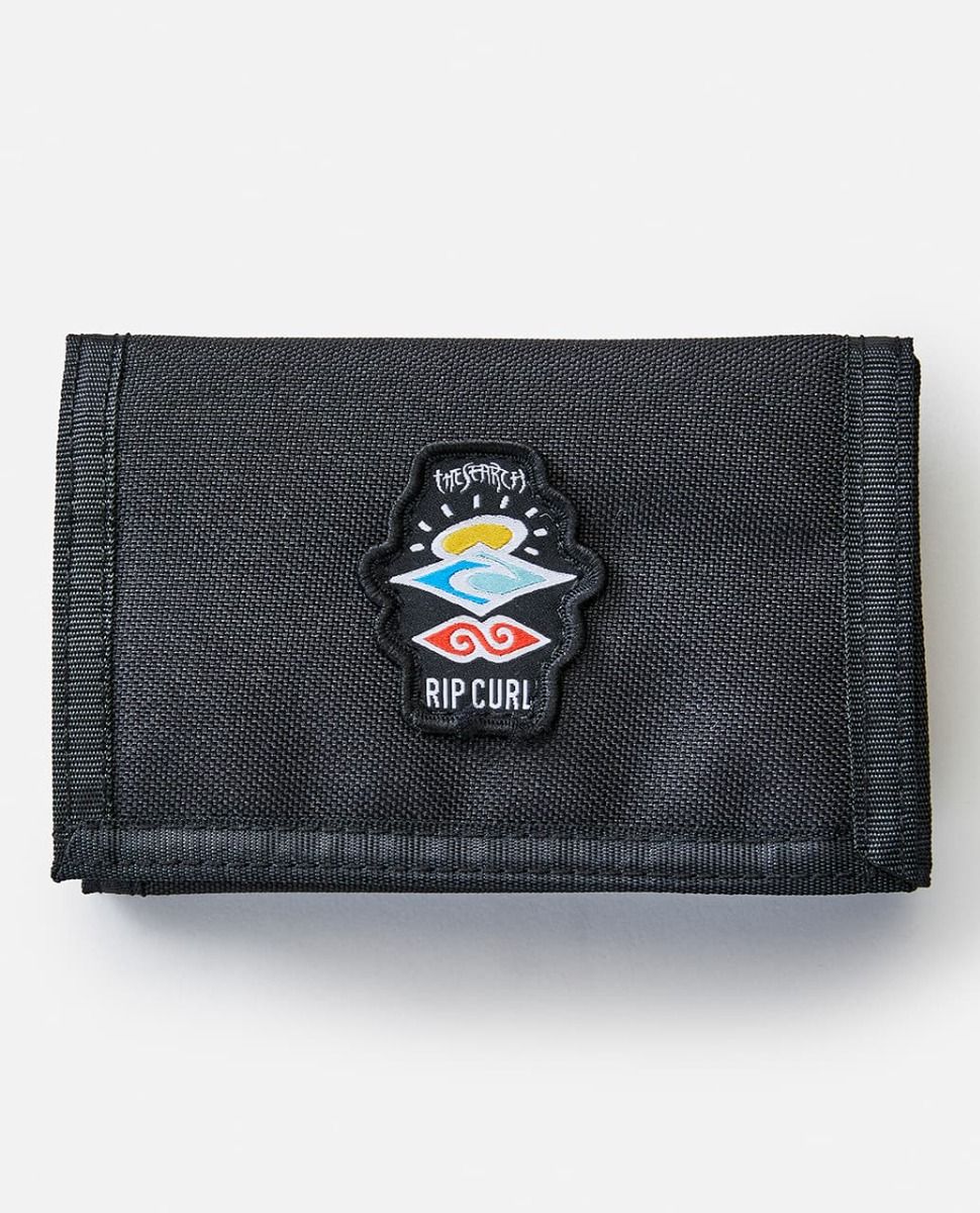 Esta cartera con diseño de triple pliegue, perteneciente a la colección "Icons of Surf", cuenta con cierre de velcro, bolsillo para monedas con cierre de cremallera, billetera, ranuras para tarjetas, ventana para el DNI y un parche con el logo Rip Curl The Search tejido en la zona frontal.