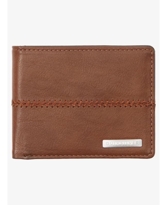 Esta cartera de tres hojas cuenta con exterior de cuero sintético, interior de poliéster, bolsillo para monedas con cremallera, ranuras interiores para tarjetas, compartimento para el DNI, detalle de puntadas en el exterior, el logo de Quiksilver serigrafiado en el interior y una placa metálica de la marca en el frente.