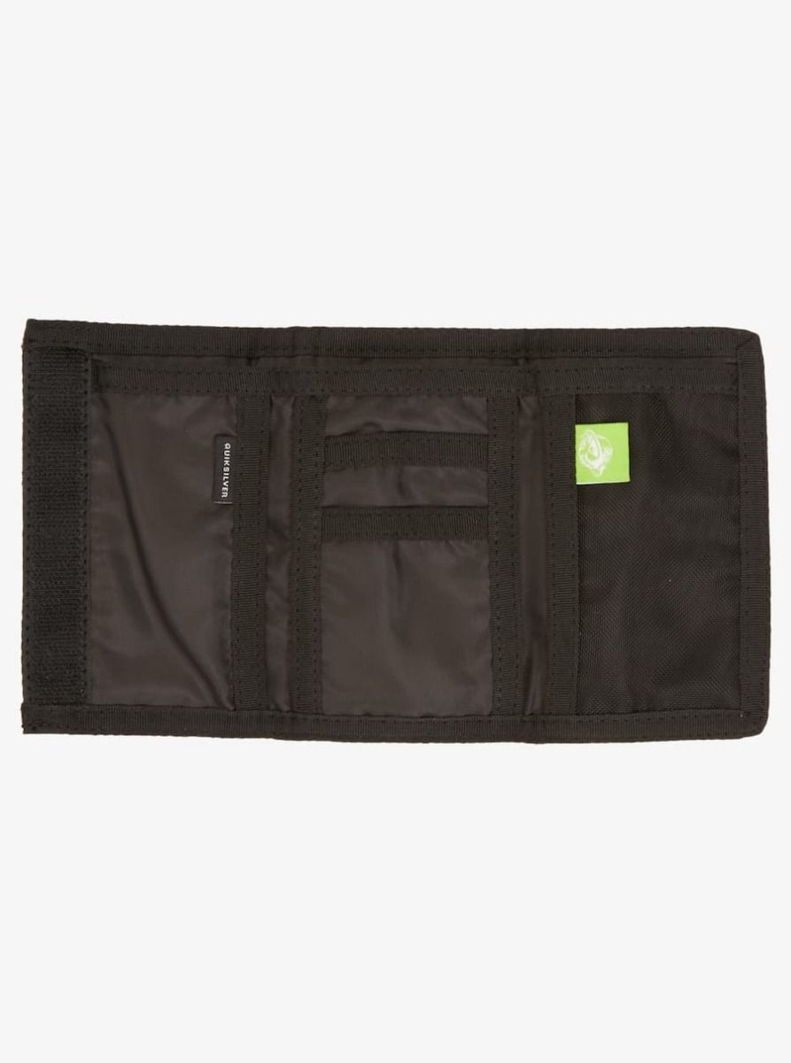 Esta cartera con diseño de triple pliegue cuenta con cierre de velcro, bolsillo exterior para monedas con cierre de cremallera, billetera, ranuras para tarjetas, ventana de malla para el DNI y un parche con el logo de Quiksilver color rojo tejido en la zona frontal.