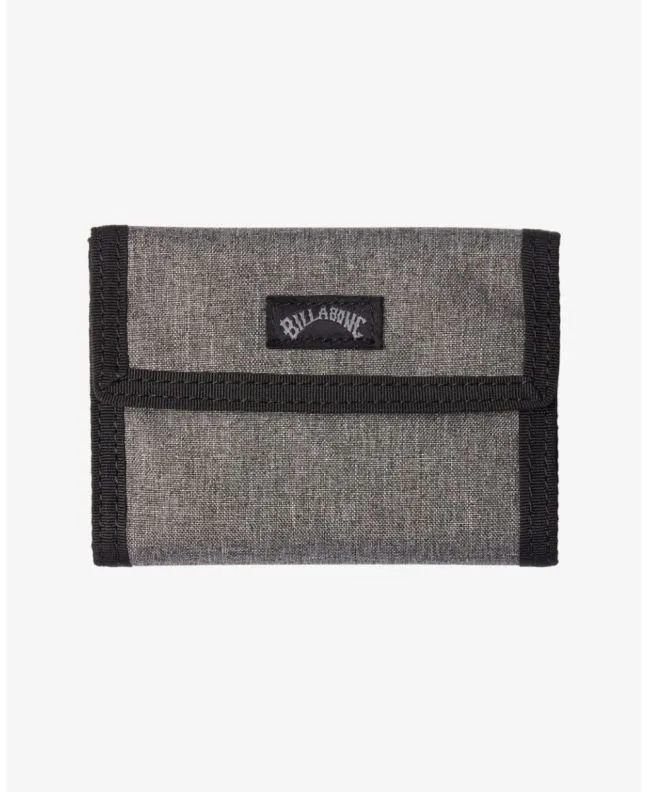 Esta billetera gris con diseño de triple pliegue cuenta con cierre autoadherente de velcro, compartimento para billetes, bolsillo exterior monedero con cierre de cremallera, 6 ranuras para tarjetas y un parche con el logo Billabong cosido en la parte delantera.