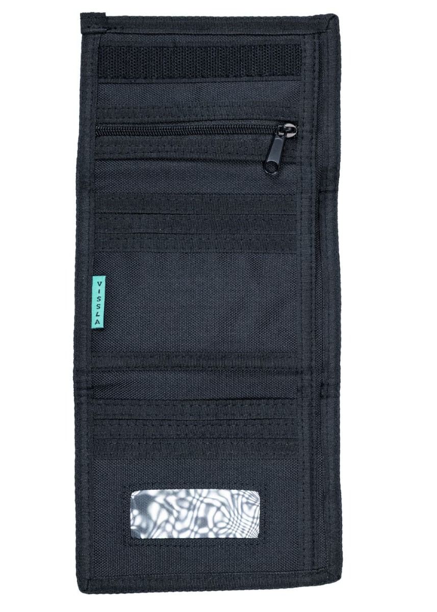 Cartera negra Vissla para hombre con triple pliegue, cierre de velcro y diseño funcional con múltiples ranuras, bolsillo de cremallera para monedas y ventana para DNI.
