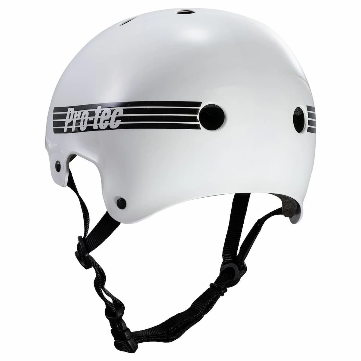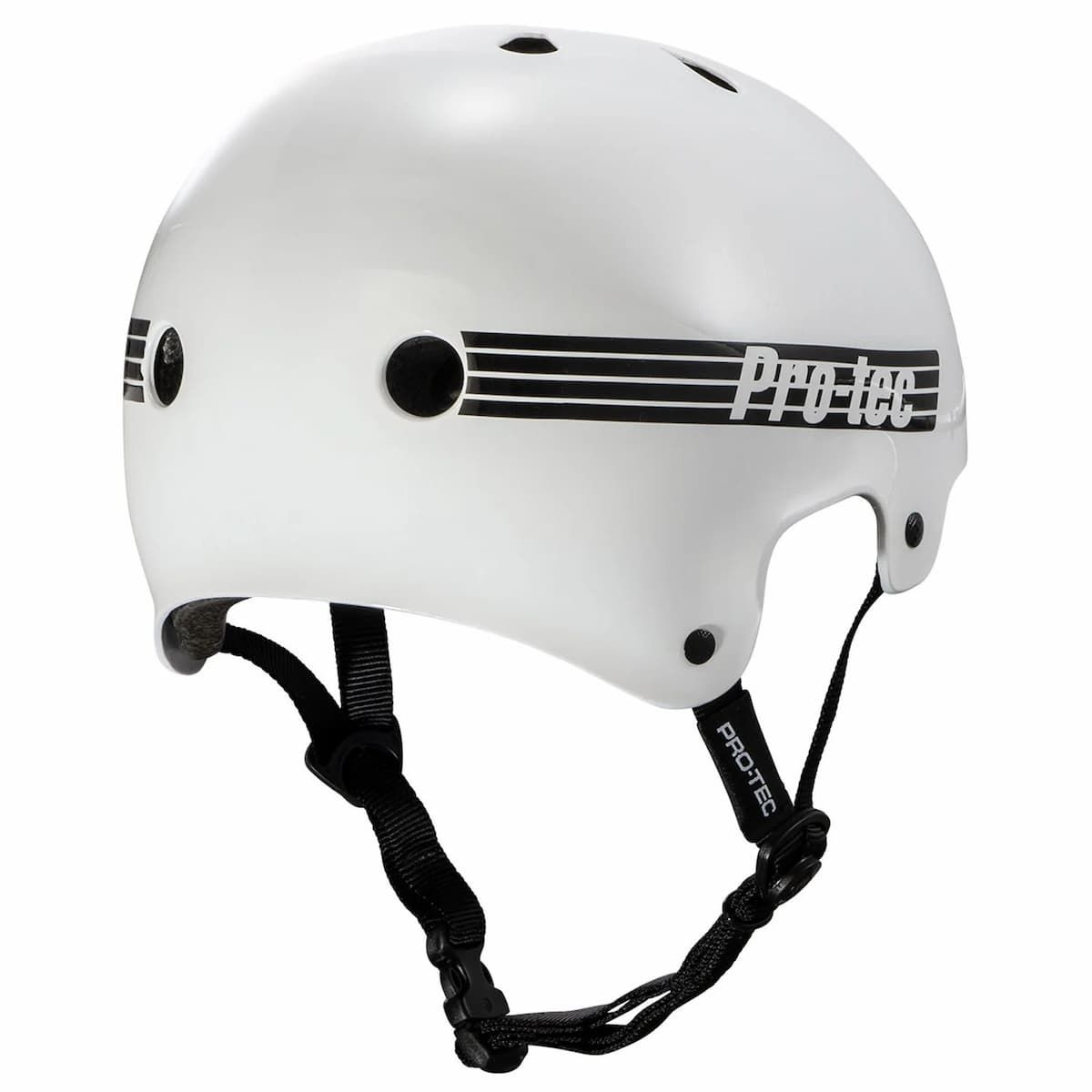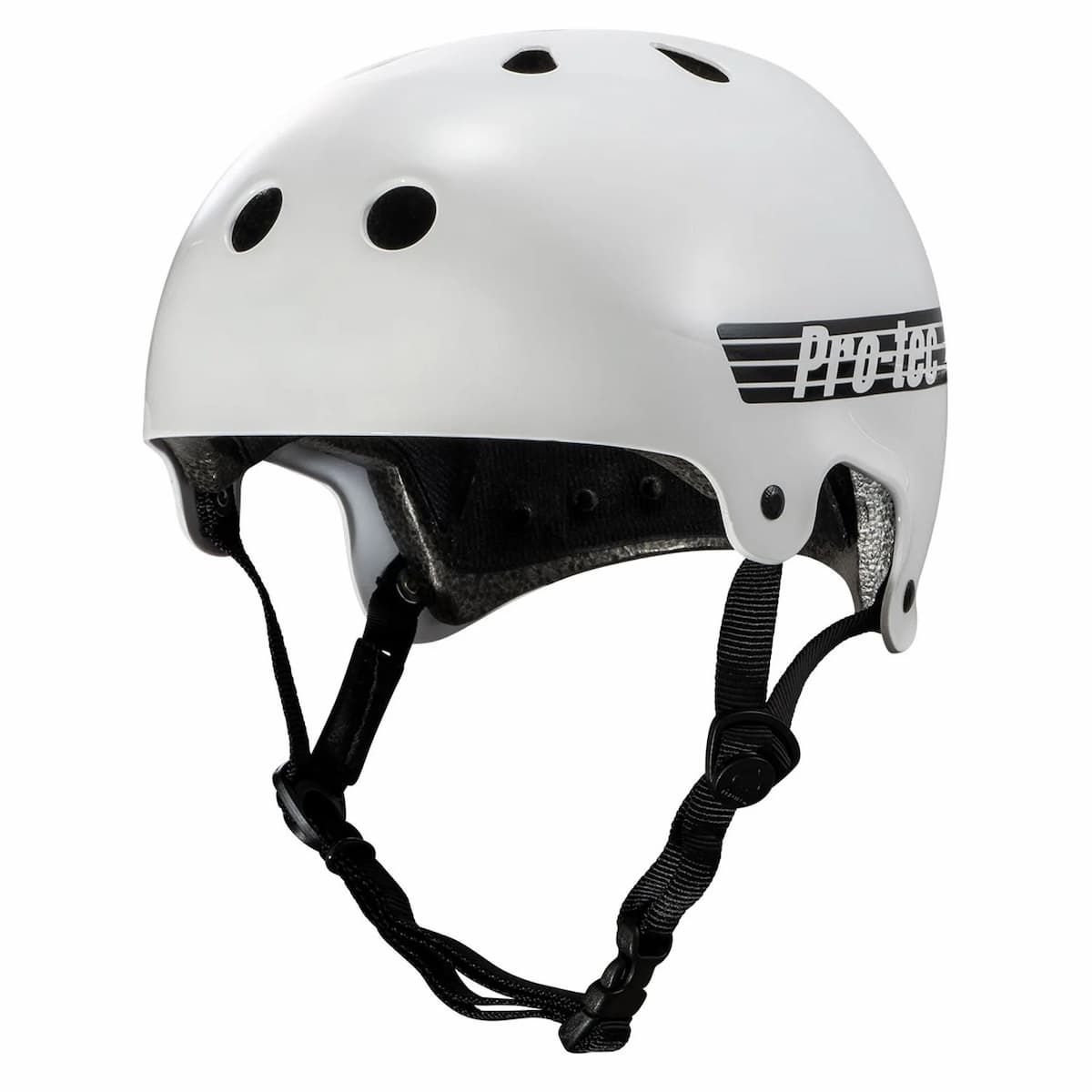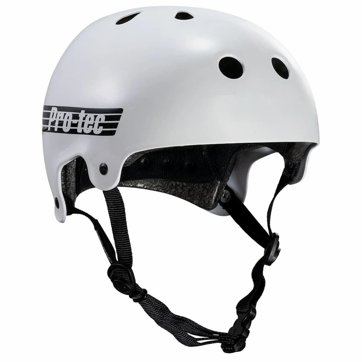 Casco Pro-Tec Old School Gloss White con carcasa ABS, forro EPS y certificaciones internacionales. Diseño clásico, comodidad premium y ventilación para skate o BMX.