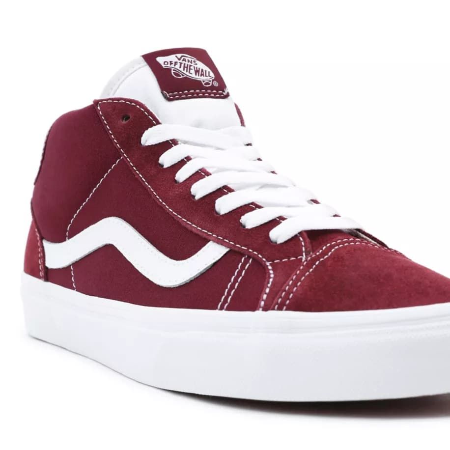 Las Zapatillas de media caña Mid Skool 37 de Vans en color granate con la banda lateral en blanco han sido fabricadas con cuero y tela.