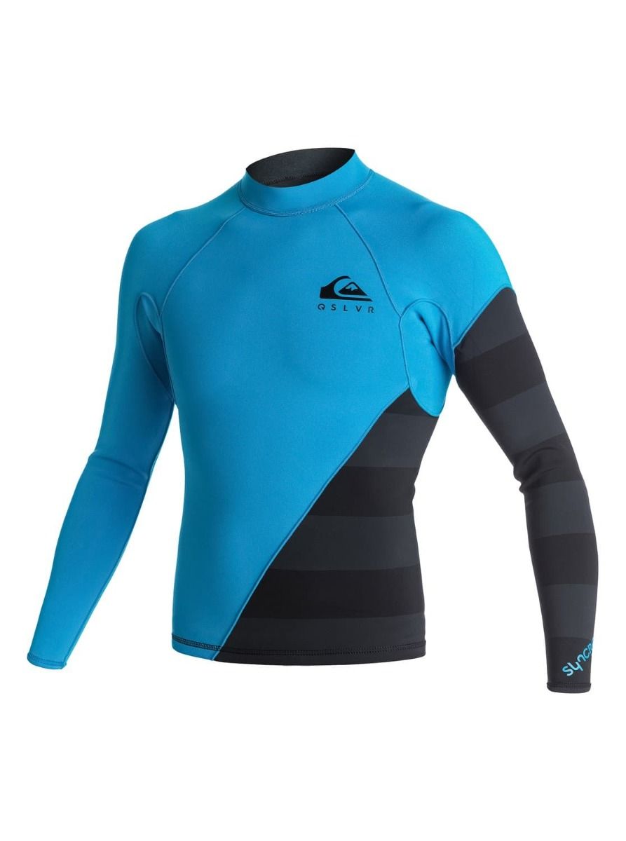 El top de surf para hombre Syncro 1mm en color negro y azul (Black-Cyan) de Quiksilver está confeccionado con Neopreno F'N Lite, que contiene celdas de aire para mayor ligereza mientras conserva el calor, y Neopreno Thermal Smoothie de gran flexibilidad que repele el viento y el agua.
