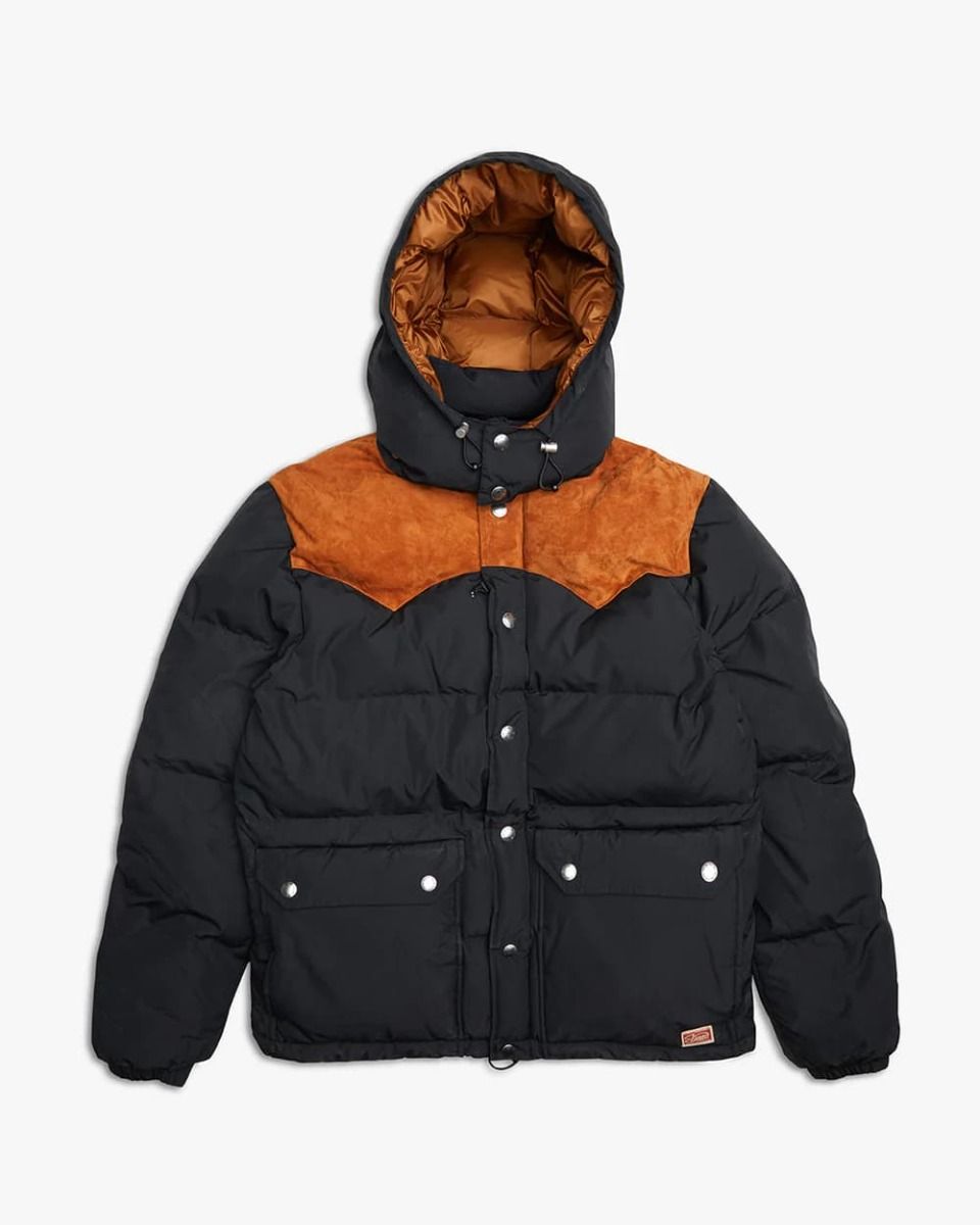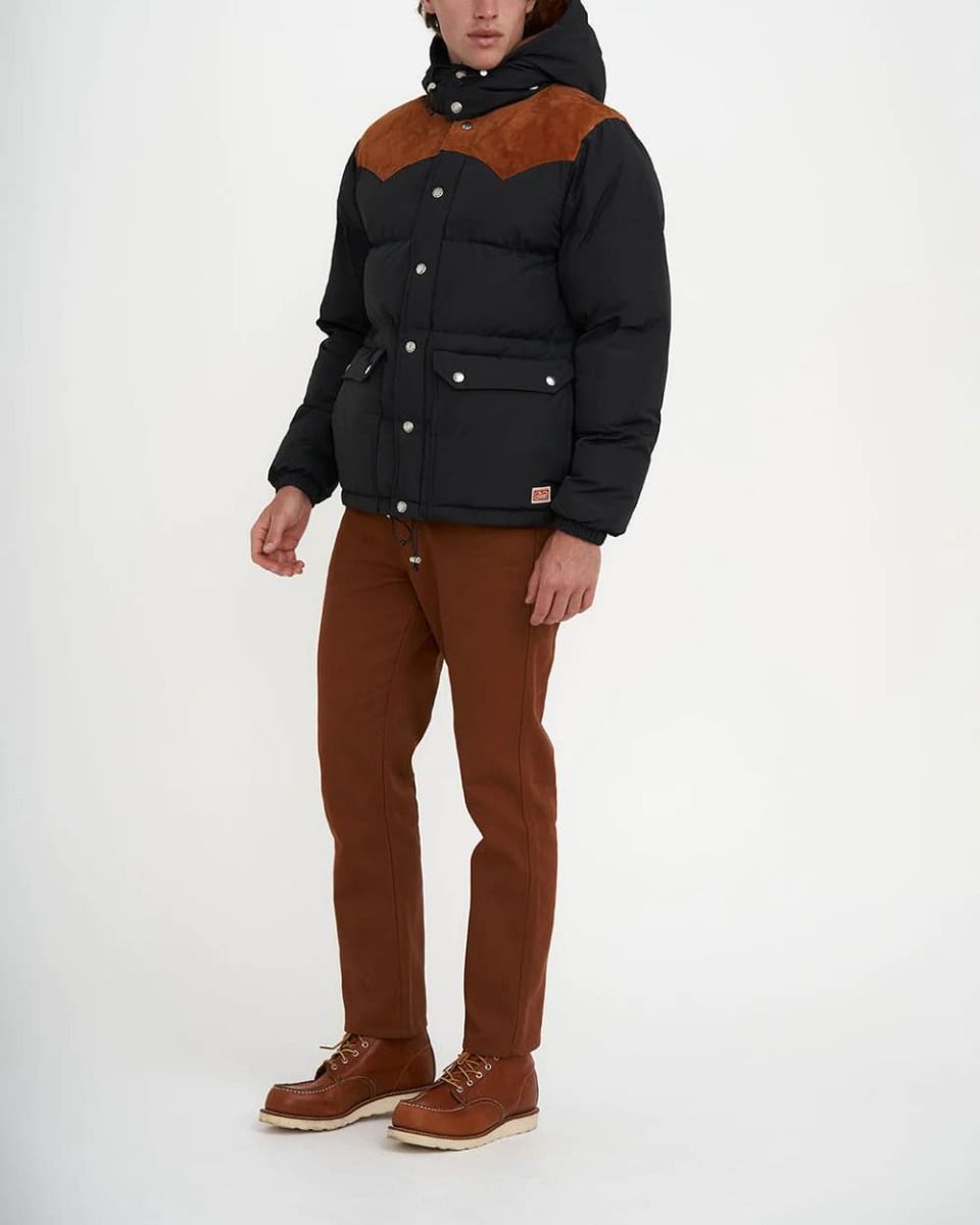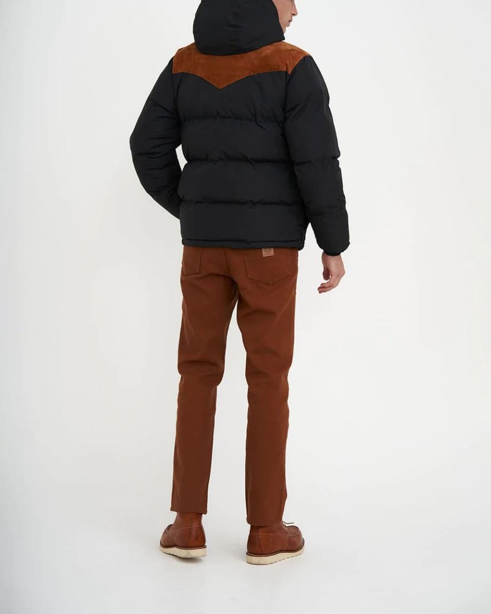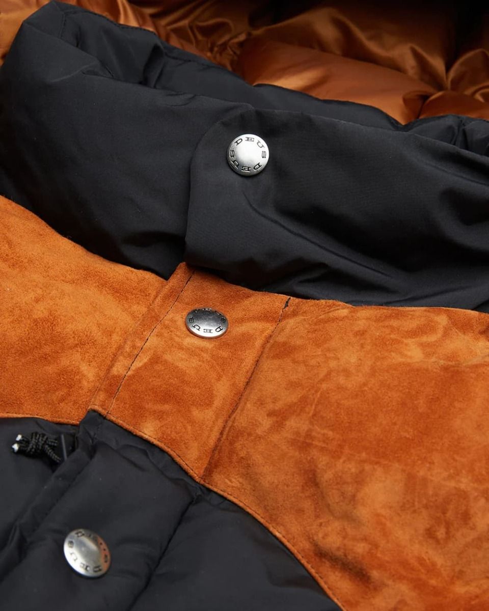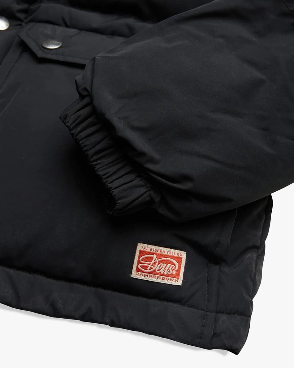 Esta cazadora de diseño acolchado cuenta con aislamiento 3M Thinsulate, relleno acolchado de poliéster, capucha ajustable, capa externa resistente al agua, cuello alto, cierre frontal de cremallera completa con solapa antiviento con cierre de botones metálicos a presión, dos bolsillos delanteros de solapa con botón, puños elásticos, dobladillo ajustable, canesú de piel de ante marrón y un parche de "The riders friend. Deus. Camperdown" tejido en el bolsillo izquierdo.