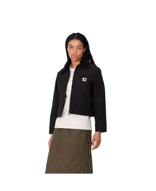 Esta cazadora de corte holgado para mujer viene con forro interior de tafetán de poliéster, puños y dobladillo ajustables, cuello de borreguillo, costuras triples para mayor durabilidad, cierre frontal de cremallera bidireccional oculta, un bolsillo en el pecho con cremallera, dos bolsillos laterales, un bolsillo interior y una etiqueta cuadrada con el logo de Carhartt tejida en el lado izquierdo del pecho.