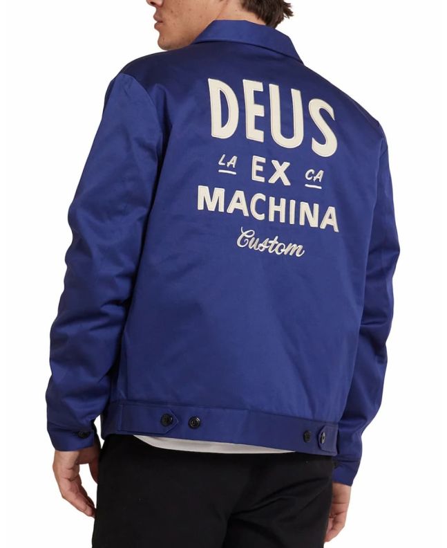 Esta cazadora Workwear Azul, perteneciente a la Colección Classics de Deus, presenta ajuste regular, tejido sometido a lavado pesado en prenda para mayor suavidad, cierre frontal de cremallera completa, dos bolsillos laterales, cintura ajustable con botones, el logo Shield de DEUS bordado en el lado izquierdo del pecho y la inscripción "Deus Ex Machina Custom. LA CA" bordada en la espalda.