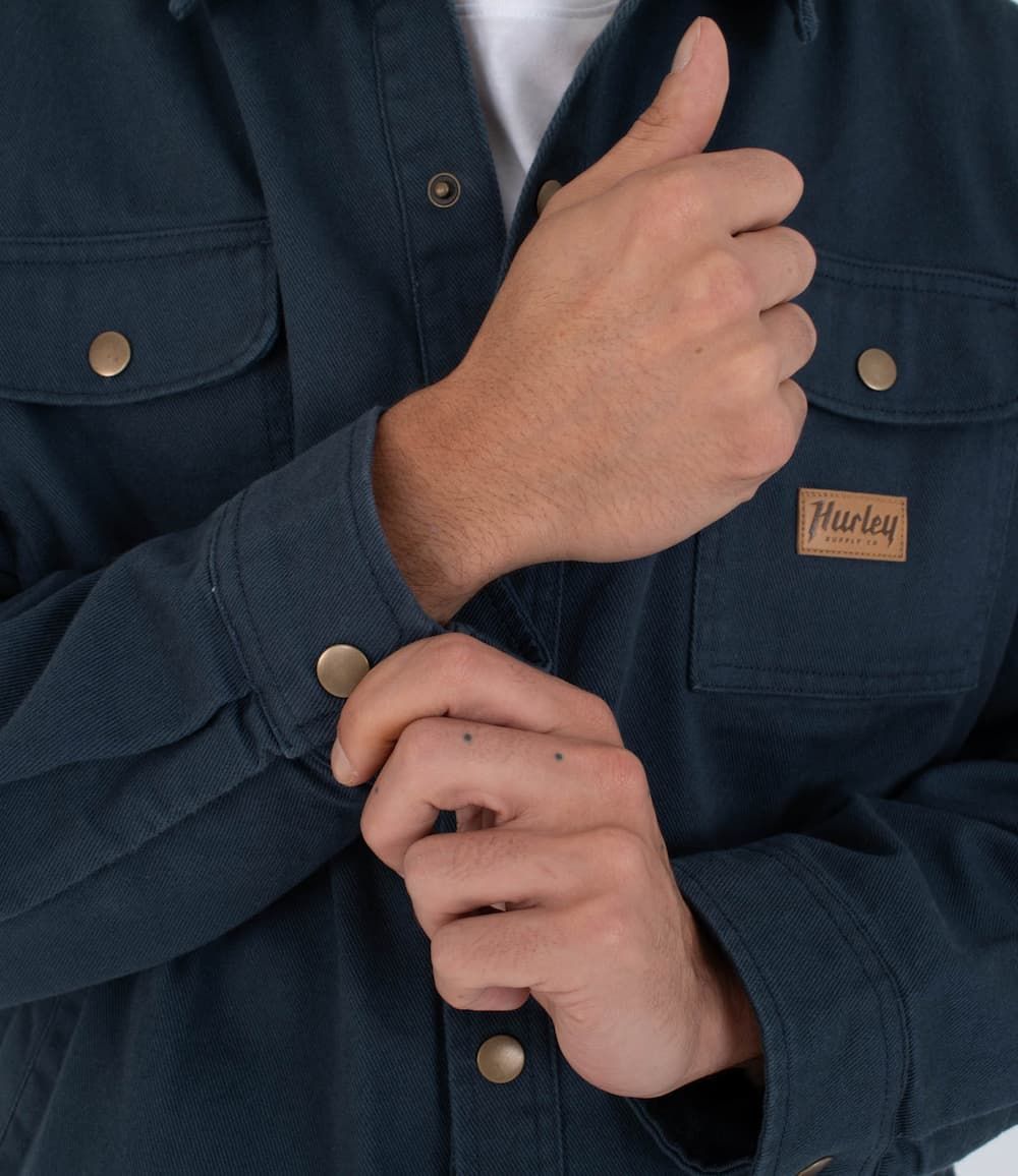 El parche de cuero con el logotipo Hurley cosido al bolsillo del pecho añade un guiño a la herencia workwear de la marca. Además, la etiqueta tejida en la nuca y la presilla interior de paracord rematan el diseño con referencias sutiles al mundo del surf y del outdoor funcional.