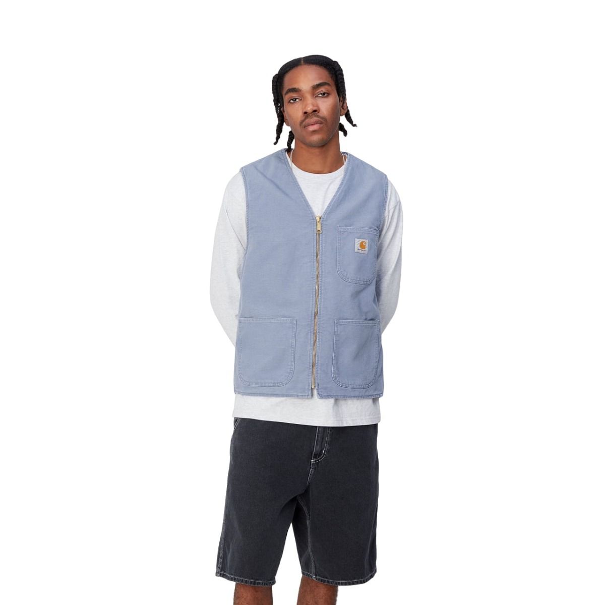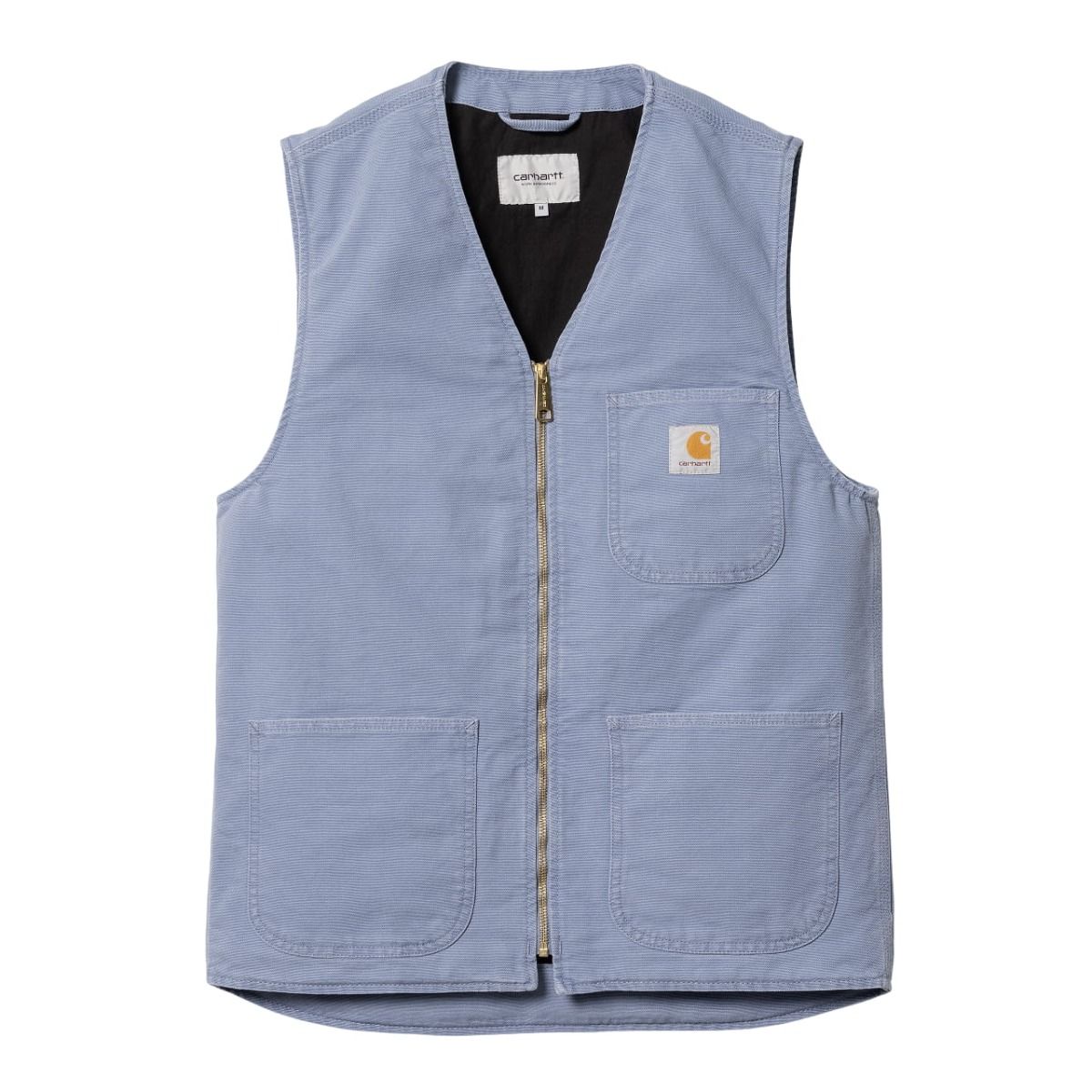Este chaleco ligero azulado viene con forro de popelina de algodón, cierre frontal de cremallera en tono dorado, puntadas triples, dos bolsillos delanteros, un bolsillo en el pecho y una etiqueta cuadrada con el logo de Carhartt tejida en el bolsillo del pecho.
