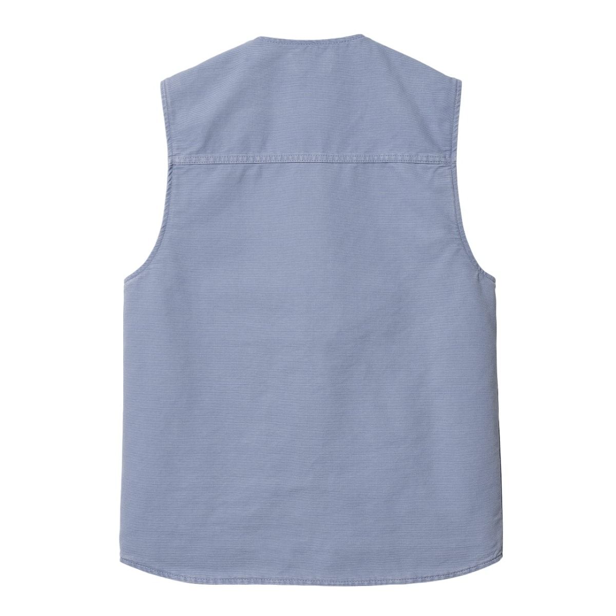 El chaleco para hombre Arbor Vest en tono azul claro envejecido (Bay Blue-Aged Canvas) de Carhartt WIP está confeccionado con lona Dearborn Canvas de 100% algodón orgánico (340g).
