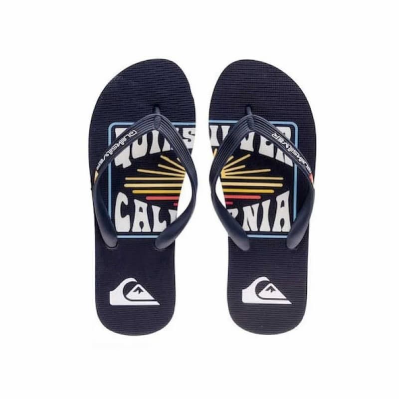 Estas sandalias de playa azules cuentan con correa flexible en 3 puntos de goma sintética, suela exterior rediseñada de goma adherente con muescas multiángulo para un agarre óptimo en superficies resbaladizas, plantilla con textura antideslizante, finas líneas en colores pop en el lateral, el logo de la ola y la montaña junto con la inscripción "Quiksilver California" impresos en la plantilla y moldeado Quiksilver en la correa.