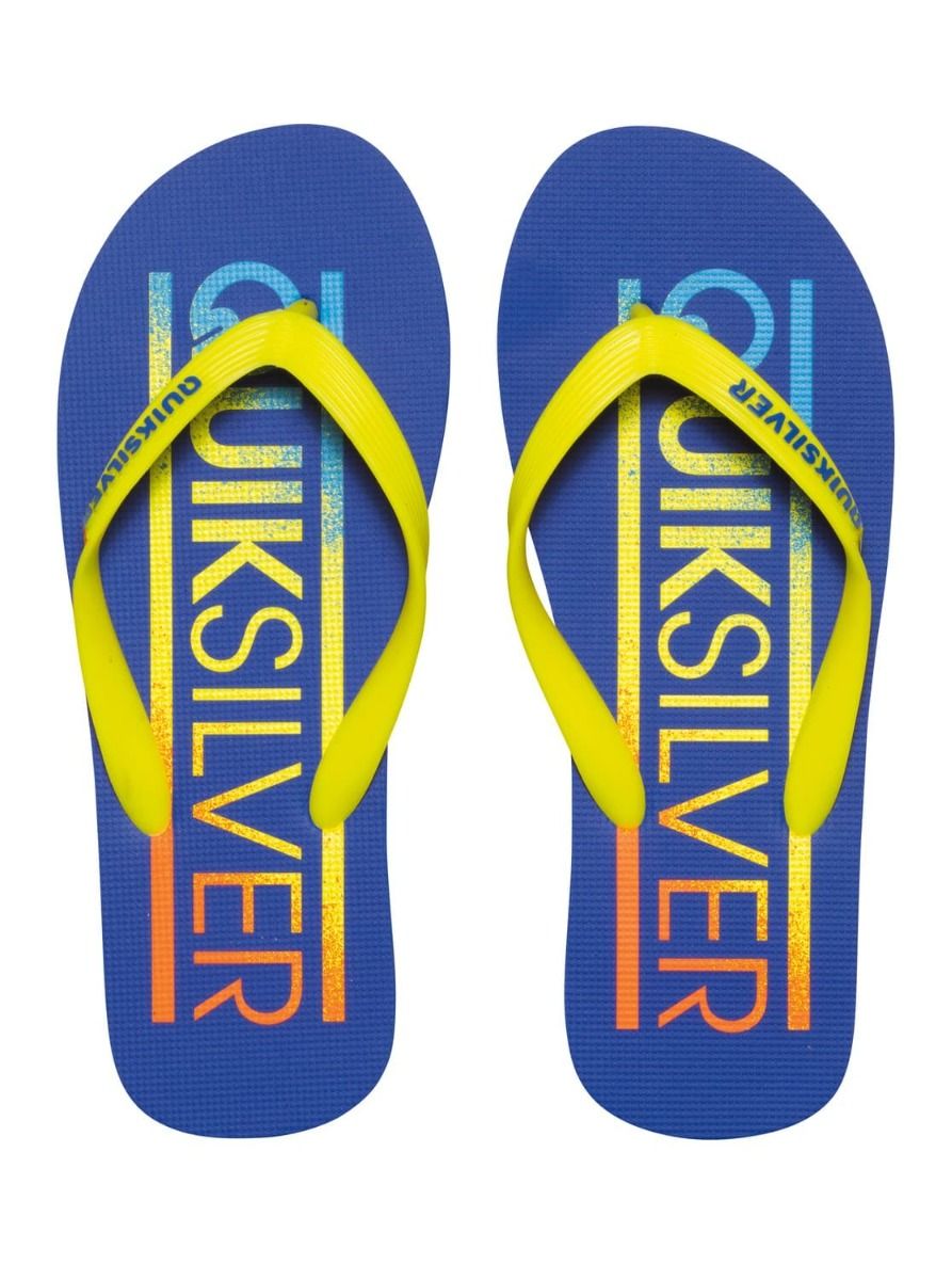 Las chanclas para hombre Molokai Wordmark de Quiksilver en azul y amarillo tienen el sello de garantía Quiksilver.
