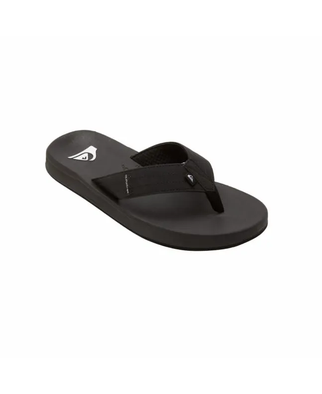 Estas sandalias playeras de dedo negras cuentan con parte superior de piel sintética vegana impermeable, plantilla Hydrobound™ blanda con perfil anatómicamente correcto para mayor comodidad, forro texturizado transpirable, suela exterior de goma anti-deslizante con muescas multi-ángulo con el logo de Quiksilver para mayor tracción, el logo de de la ola y la montaña grabado en la plantilla, junto con una etiqueta de la marca tejida en la correa.