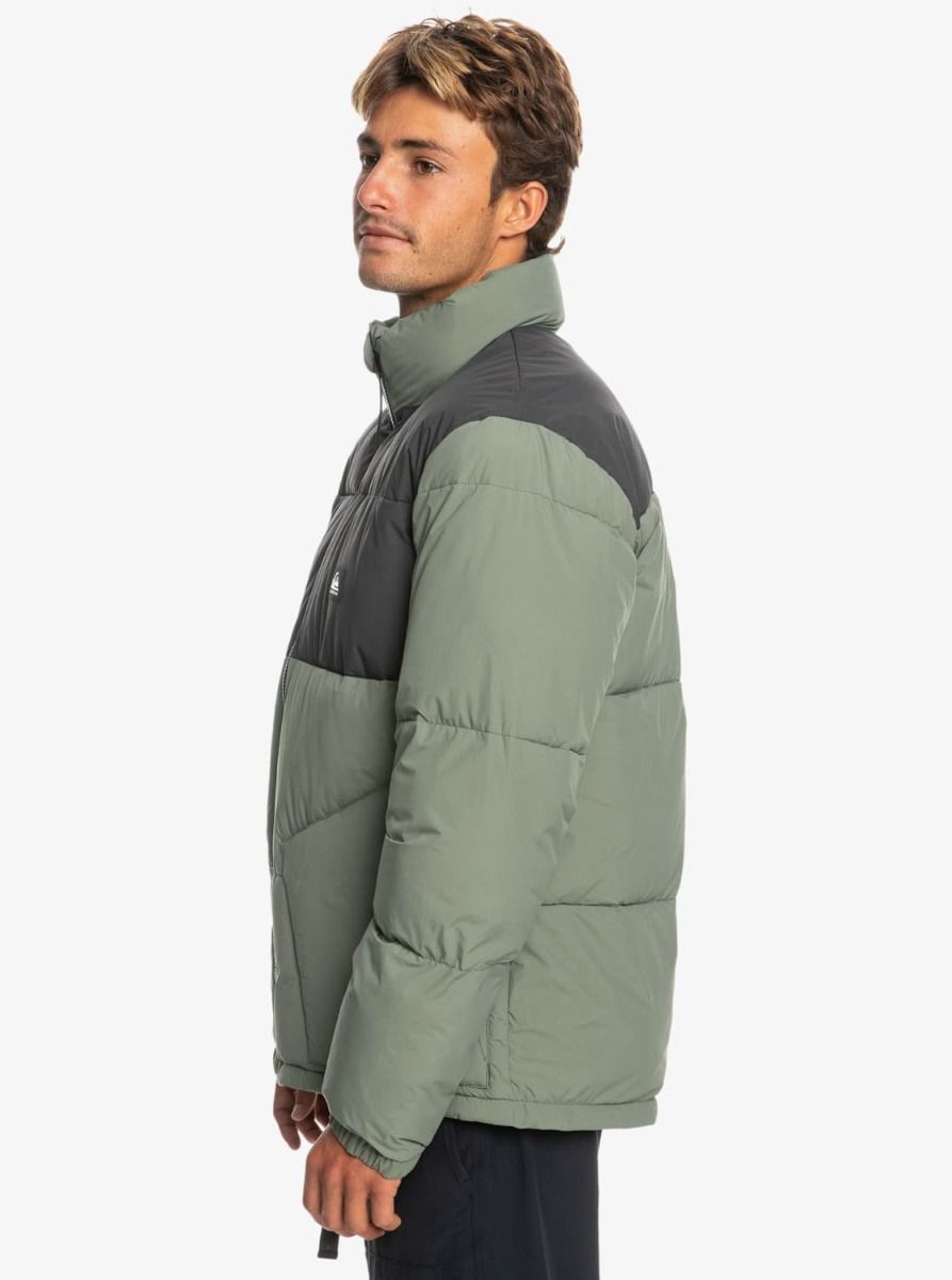La chaqueta acolchada e impermeable para hombre Wild Mountain Cold Weather Puffy Jacket en tono verde (Laurel Wreath) de Quiksilver está confeccionada con tejido ripstop de poliéster reciclado (86 g/m2) con tratamiento duradero que repele el agua (DWR) sin PFC.