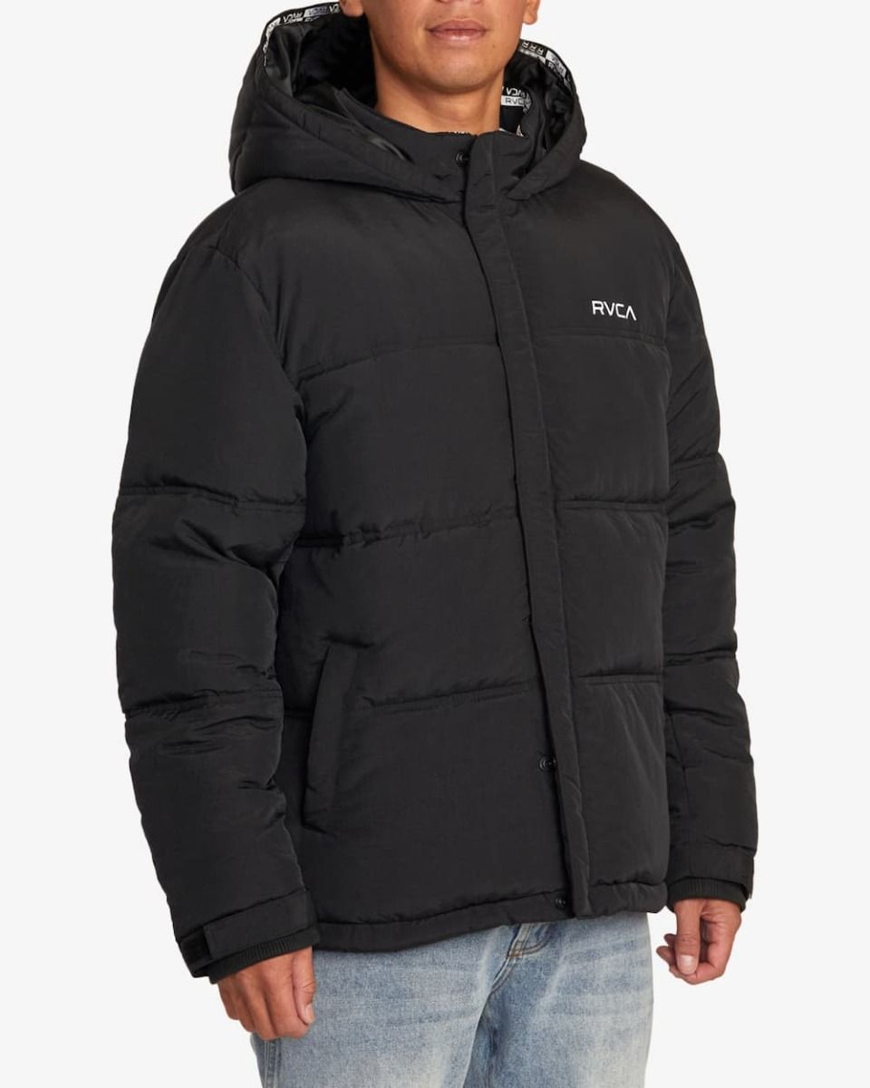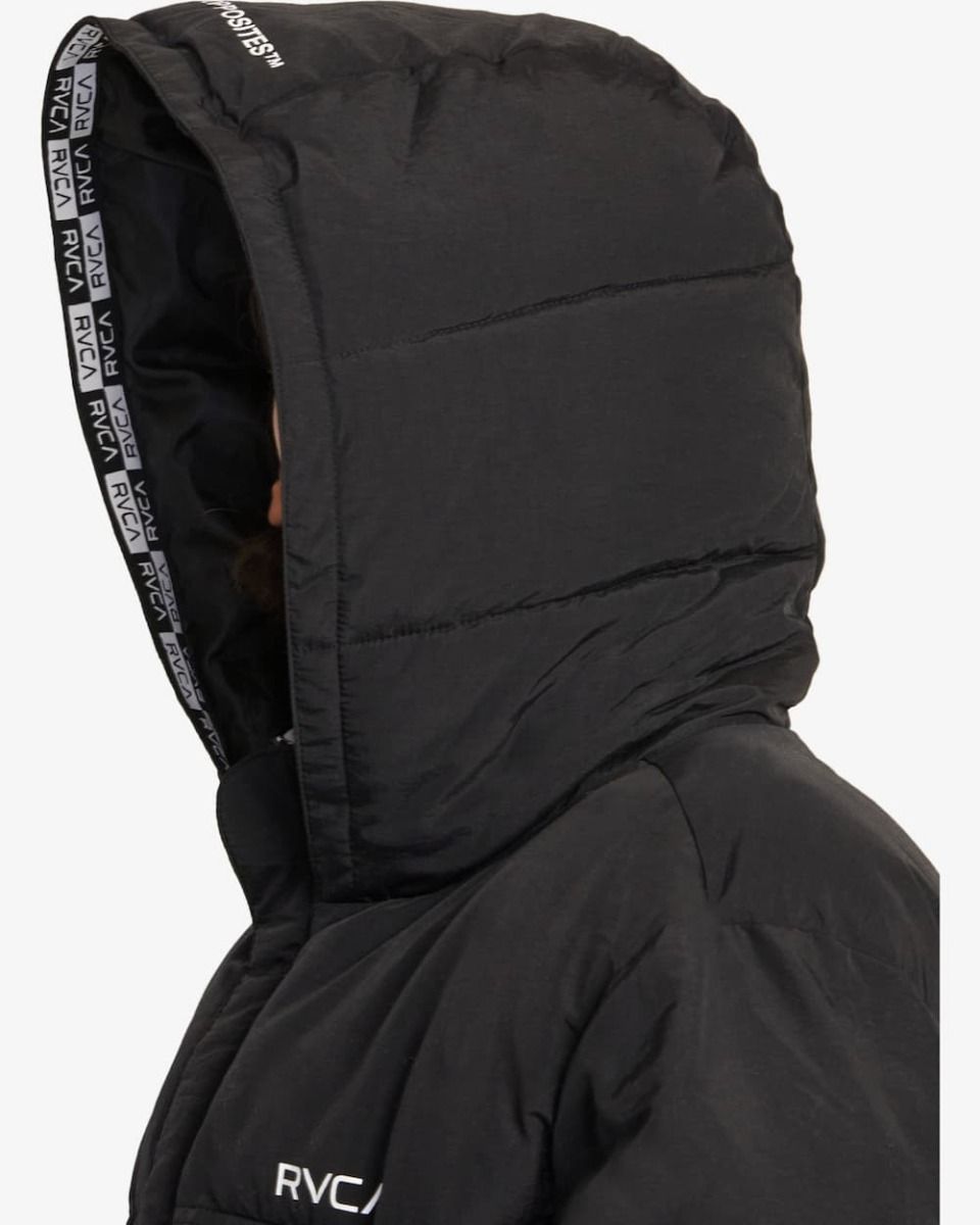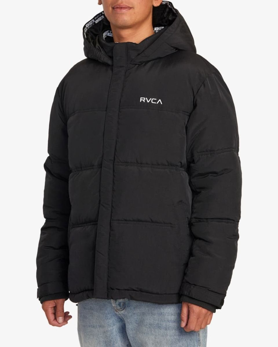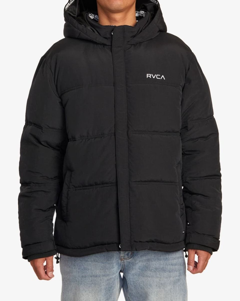 Este plumífero de ajuste relajado, diseñado especialmente para hacer frente a las inclemencias del tiempo, cuenta con relleno acolchado de nailon para mayor calidez, capucha, cuello alto, cierre frontal de cremallera completa, solapa anti-viento con cierre de botones a presión, dos bolsillos delanteros de ojal, un bolsillo interior, correas de ajuste, interior de la capucha con cinta Rvca, puños ajustables con velcro y serigrafiado RVCA en color blanco en el lado izquierdo del pecho.