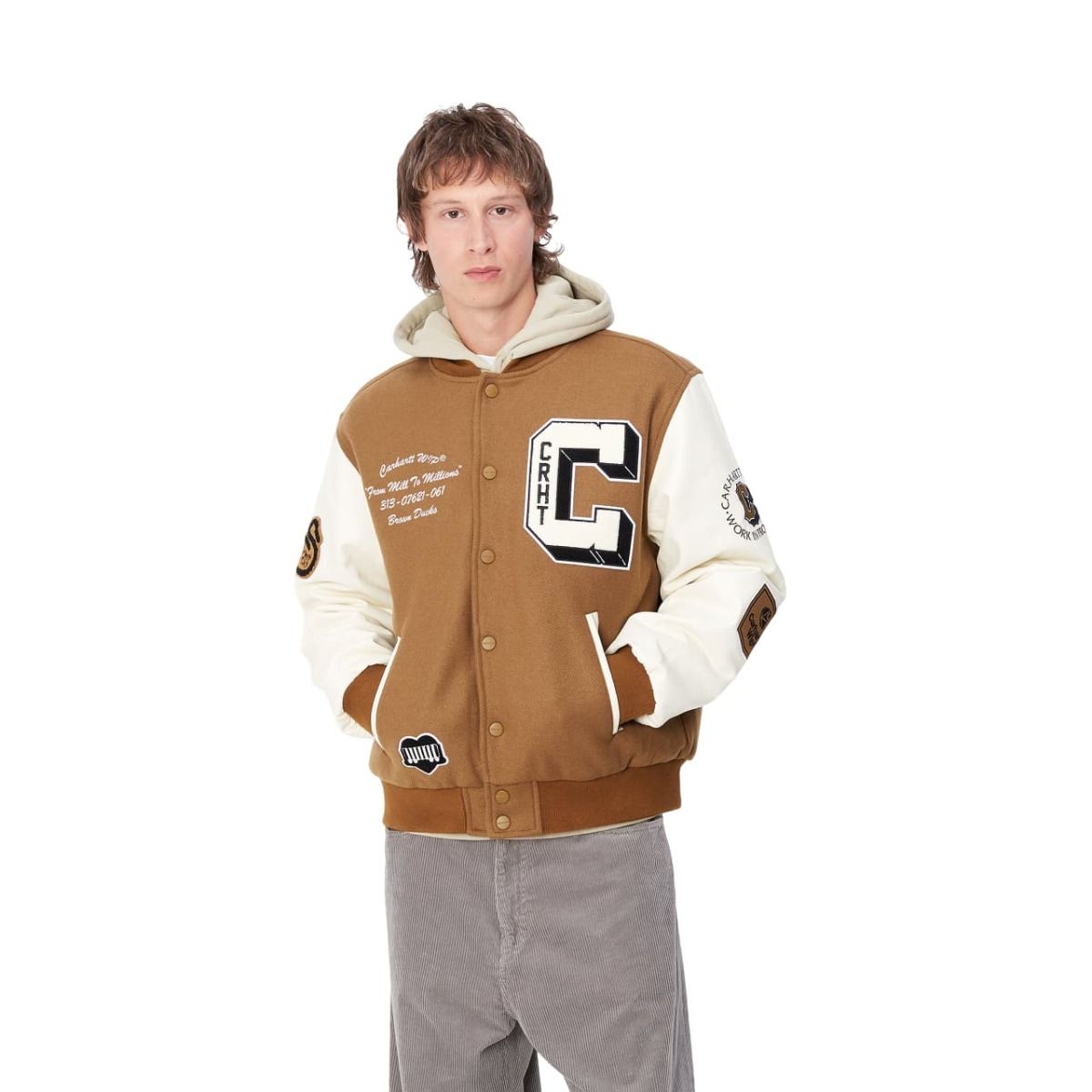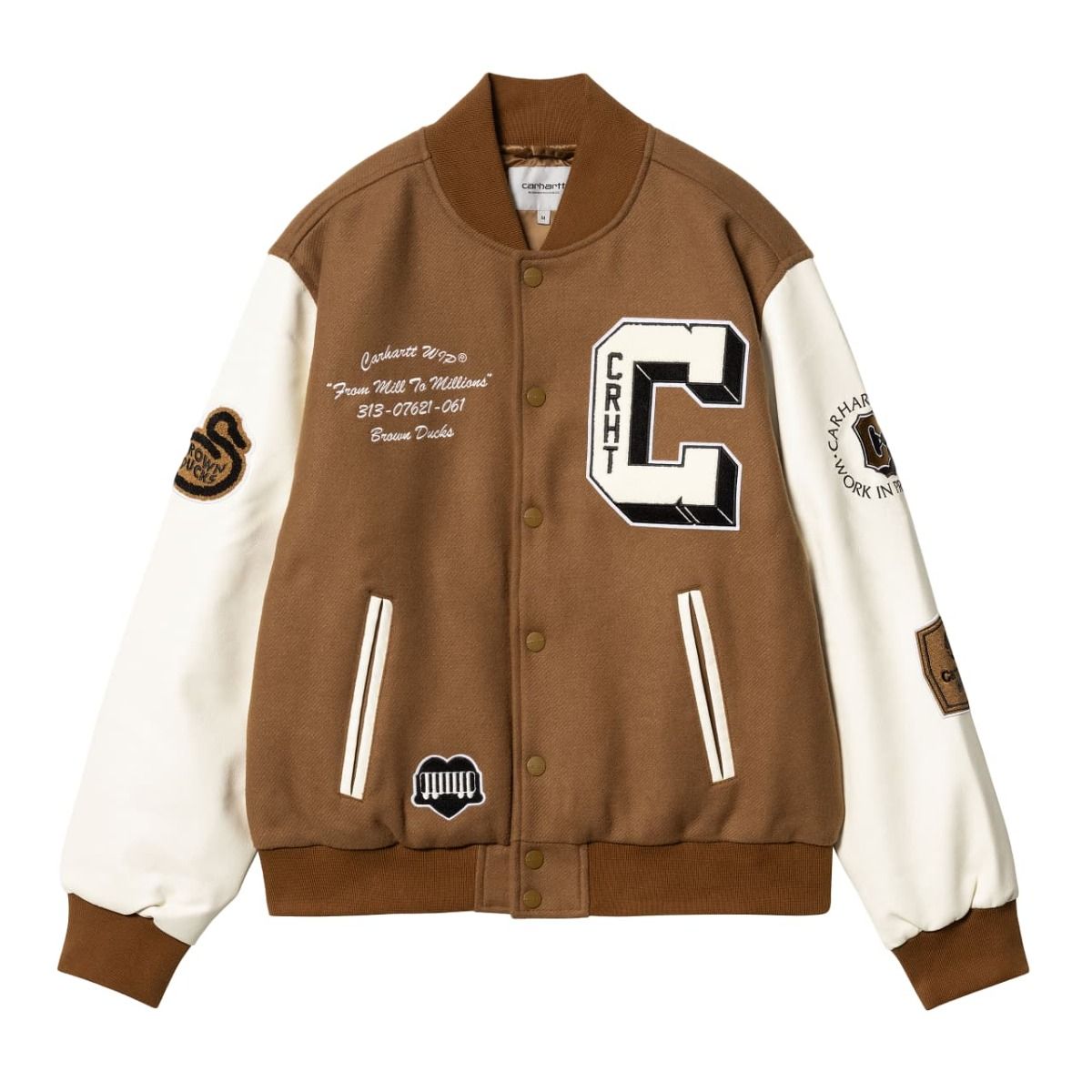 La chaqueta de estilo universitario para hombre Brown Ducks Bomber en tono marrón hamilton y blanco cera (Hamilton Brown-Wax) de Carhartt WIP está confeccionada con 70% poliéster y 30% lana (14,2oz).