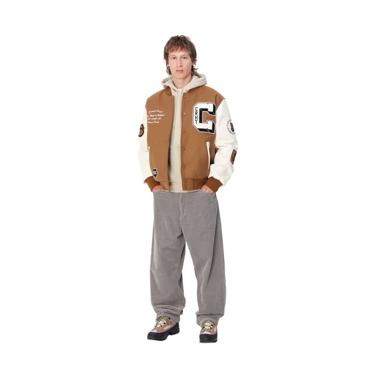 Esta cazadora bomber presenta cuerpo de fieltro de mezcla de poliéster, mangas de piel sintética, interior forrado con satén de nailon, cuello, banda del bajo y puños acanalados, cierre de botones a presión, junto con parches y bordados decorativos Carhartt y Brown Ducks.