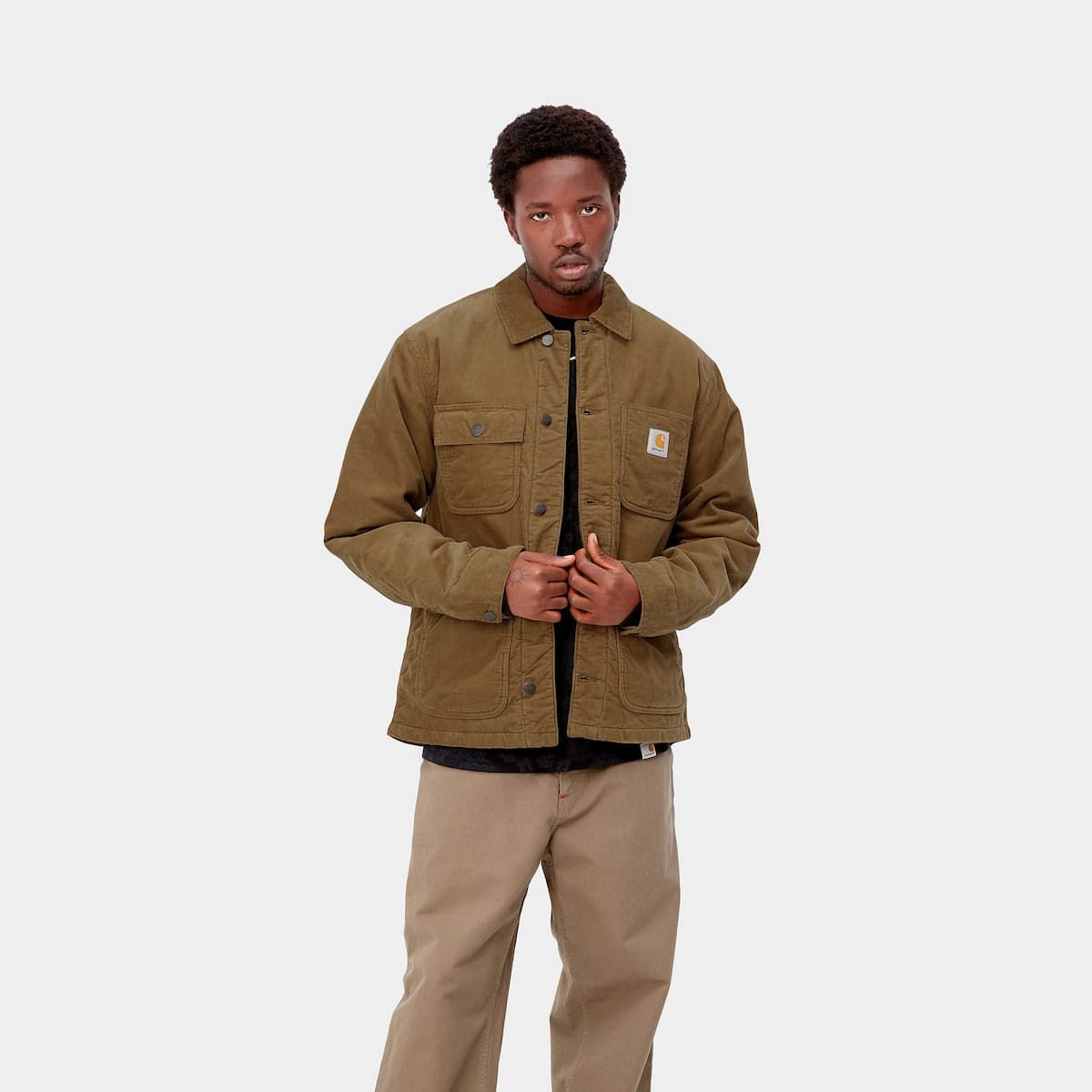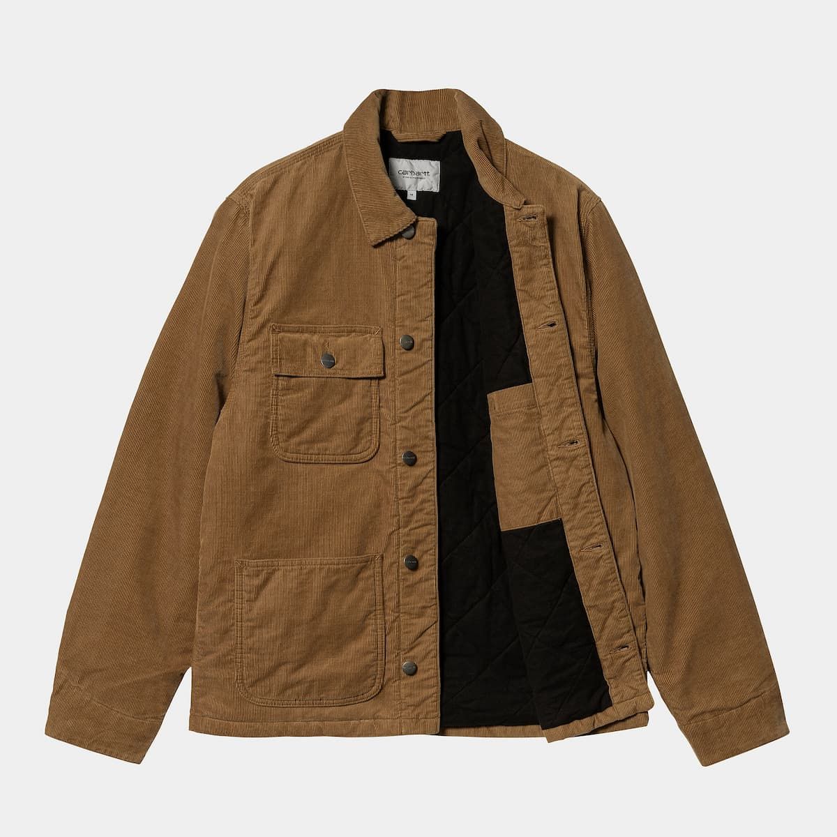 Esta chaqueta de pana cuenta con la silueta clásica de los abrigos de trabajo, ajuste regular, cierre frontal de botones, interior enguatado de rombos para mayor calidez, cuerpo forrado de popelina (100% algodón), mangas forradas de 100% nailon, puntadas triples, cuatro bolsillos de parche delanteros, un bolsillo interior y una etiqueta cuadrada de Carhartt cosida en la parte delantera.