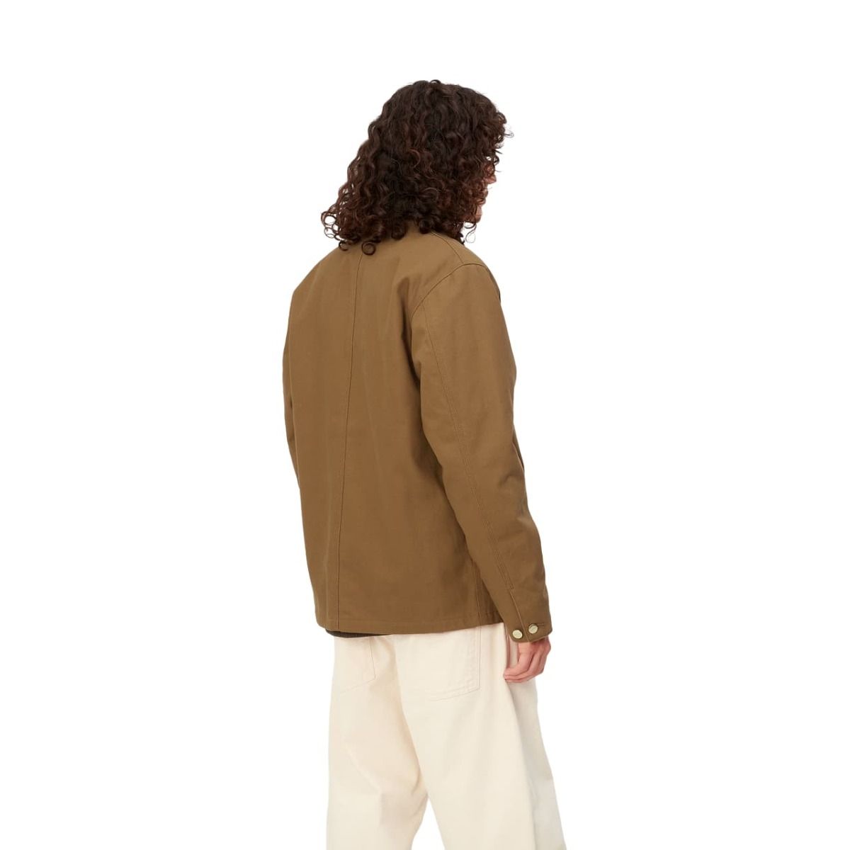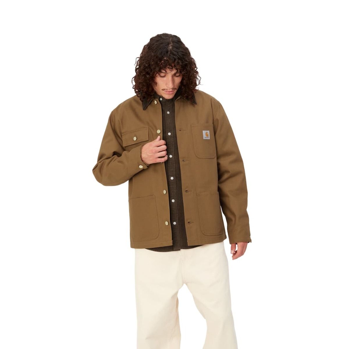 Esta chaquetón presenta un diseño inspirado en la estética clásica de la ropa de trabajo, tejido que se va suavizando con el uso, ajuste regular, cierre frontal de botones, cuerpo forrado de manta para conservar mejor el calor, mangas forradas de nailon, cuello de pana, puntadas triples, cuatro bolsillos de parche delanteros, puños ajustables y una etiqueta cuadrada de Carhartt cosida en el bolsillo superior izquierdo.