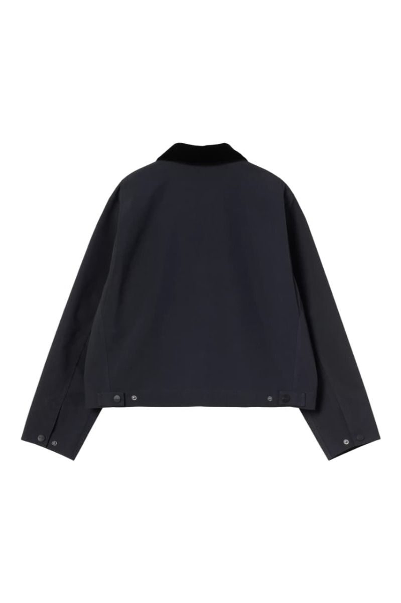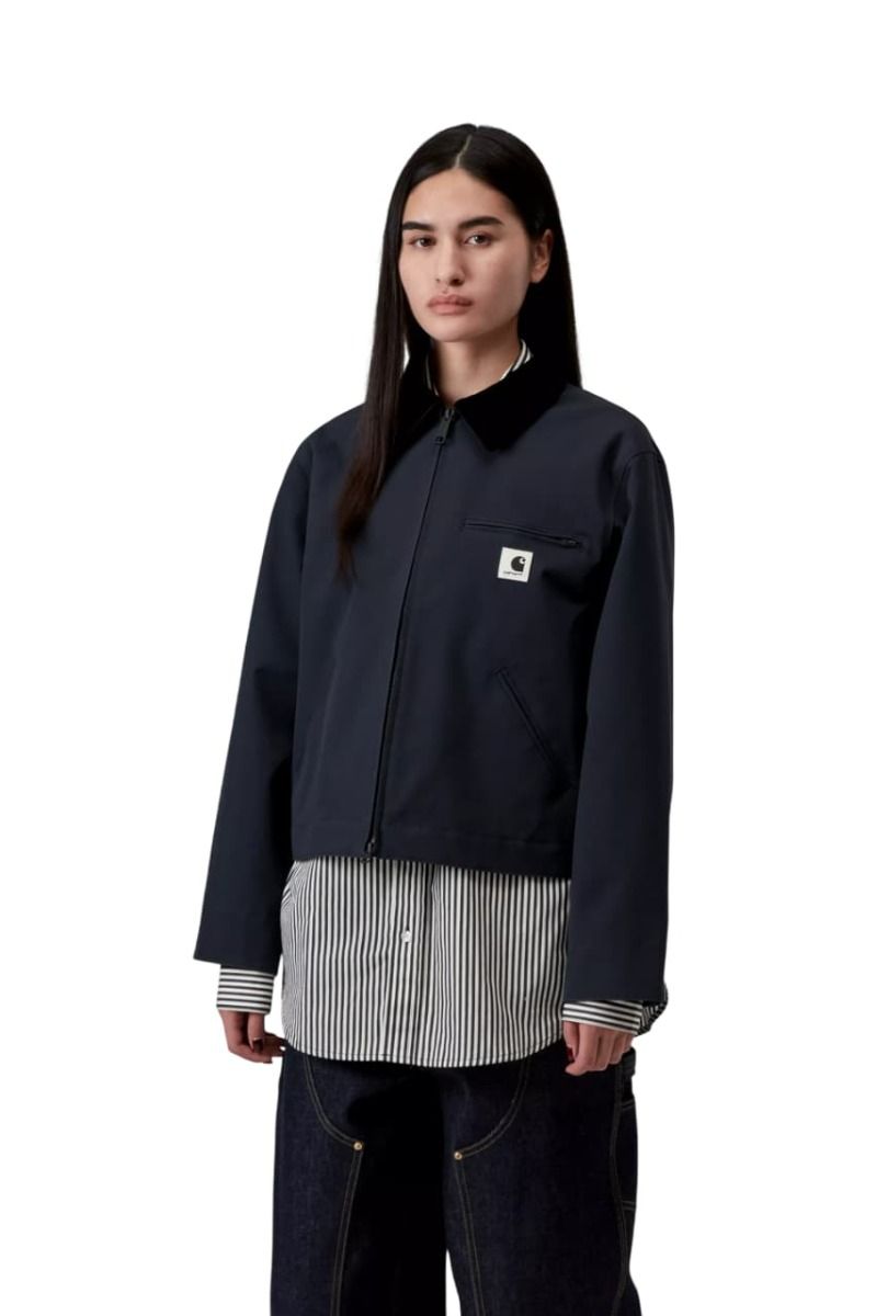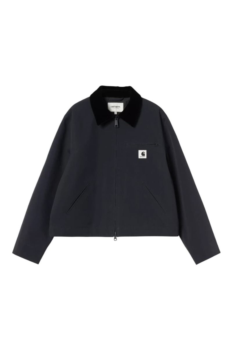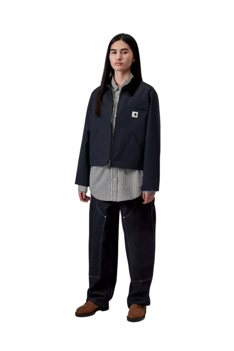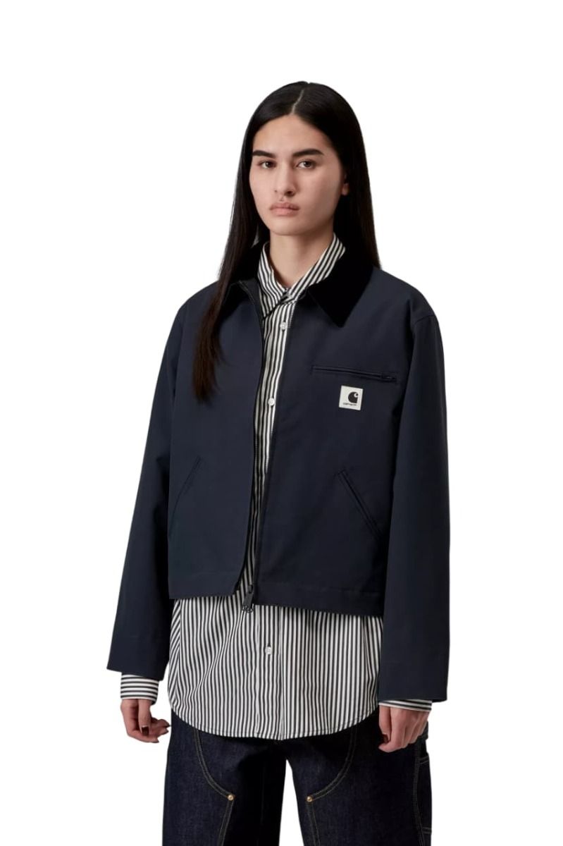 Este modelo presenta una silueta cropped con corte recto, un cuello de pana negra que marca contraste y cierre frontal con cremallera metálica bidireccional. Los bolsillos delanteros ribeteados y el bolsillo con cremallera en el pecho refuerzan la estética funcional inspirada en el workwear, aportando espacio seguro y práctico para tus esenciales. El logo cuadrado tejido en el pecho izquierda añade el toque icónico de Carhartt WIP.