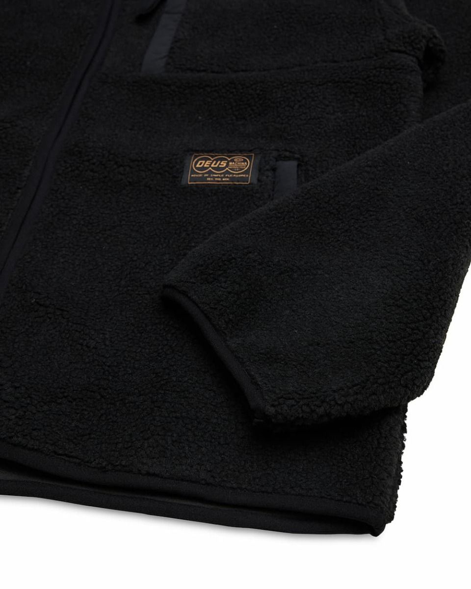 Este forro polar tipo chaqueta cuenta ajuste relajado, cálido y suave forro polar sherpa, cierre frontal de cremallera completa, cuello medio, bolsillo del pecho y laterales con cremallera, junto con una etiqueta de Deus tejida en el bolsillo inferior izquierdo.